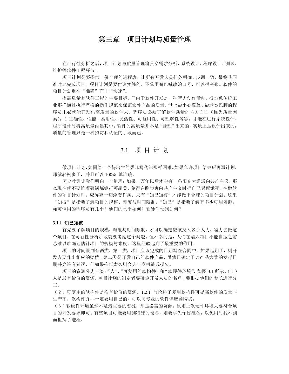 28 . 3.5 小 结 不知为什么,国内很多大的企业都喊着要进世界 500 强。如果真的实现了,世界 500 强还不全被中国霸占了。软件的项目计划和质量管理都不是用来喊叫的口号。做项目计划时 切忌“冒进”,不要指望在项目陷入困境后靠增加人手来解救。软件的高质量主要是设计出 来的,不是“管”出来的,更不能依赖质量检查。为此程序员要充分了解软件的质量因素, 只有提高设计水平,才能开发出高质量的软件。