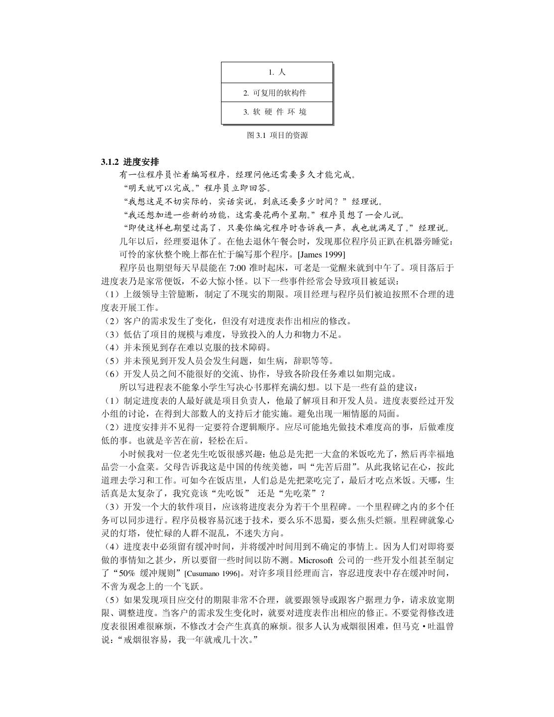 23 . 1. 人 2. 可复用的软构件 3. 软 硬 件 环 境 图 3.1 项目的资源 3.1.2 进度安排 有一位程序员忙着编写程序,经理问他还需要多久才能完成。 “明天就可以完成。”程序员立即回答。 “我想这是不切实际的,实话实说,到底还要多少时间?”经理说。 “我还想加进一些新的功能,这需要花两个星期。 ”程序员想了一会儿说。 “即使这样也期望过高了,只要你编完程序时告诉我一声,我也就满足了。 ”经理说。 几年以后,经理要退休了。在他去退休午餐会时,发现那位程序员正趴在机器旁睡觉: 可怜的家伙整个晚上都在忙于编写那个程序。[James 1999] 程序员也期望每天早晨能在 7:00 准时起床,可老是一觉醒来就到中午了。项目落后于 进度表乃是家常便饭,不必大惊小怪。以下一些事件经常会导致项目被延误: (1)上级领导主管臆断,制定了不现实的期限。项目经理与程序员们被迫按照不合理的进 度表开展工作。 (2)客户的需求发生了变化,但没有对进度表作出相应的修改。 (3)低估了项目的规模与难度,导致投入的人力和物力不足。 (4)并未预见到存在难以克服的技术障碍。 (5)并未预见到开发人员会发生问题,如生病,辞职等等。 (6)开发人员之间不能很好的交流、协作,导致各阶段任务难以如期完成。 所以写进程表不能象小学生写决心书那样充满幻想。以下是一些有益的建议: (1)制定进度表的人最好就是项目负责人,他最了解项目和开发人员。进度表要经过开发 小组的讨论,在得到大部数人的支持后才能实施。避免出现一厢情愿的局面。 (2)进度安排并不见得一定要符合逻辑顺序。应尽可能地先做技术难度高的事,后做难度 低的事。也就是辛苦在前,轻松在后。 小时候我对一位老先生吃饭很感兴趣:他总是先把一大盒的米饭吃光了,然后再幸福地 品尝一小盒菜。父母告诉我这是中国的传统美德,叫“先苦后甜”。从此我铭记在心,按此 道理去学习和工作。可如今在饭店里,人们总是先把菜吃完了,最后才吃点米饭。天哪,生 活真是太复杂了,我究竟该“先吃饭” 还是“先吃菜”? (3)开发一个大的软件项目,应该将进度表分为若干个里程碑。一个里程碑之内的多个任 务可以同步进行。程序员极容易沉迷于技术,要么乐不思蜀,要么焦头烂额。里程碑就象心 灵的灯塔,使忙碌的人群不混乱,不迷失方向。 (4)进度表中必须留有缓冲时间,并将缓冲时间用到不确定的事情上。因为人们对即将要 做的事情知之甚少,所以要留一些时间以防不测。Microsoft 公司的一些开发小组甚至制定 了“50% 缓冲规则”[Cusumano 1996]。对许多项目经理而言,容忍进度表中存在缓冲时间, 不啻为观念上的一个飞跃。 (5)如果发现项目应交付的期限非常不合理,就要跟领导或跟客户据理力争,请求放宽期 限、调整进度。当客户的需求发生变化时,就要对进度表作出相应的修正。不要觉得修改进 度表很困难很麻烦,不修改才会产生真真的麻烦。很多人认为戒烟很困难,但马克·吐温曾 说:“戒烟很容易,我一年就戒几十次。 ”