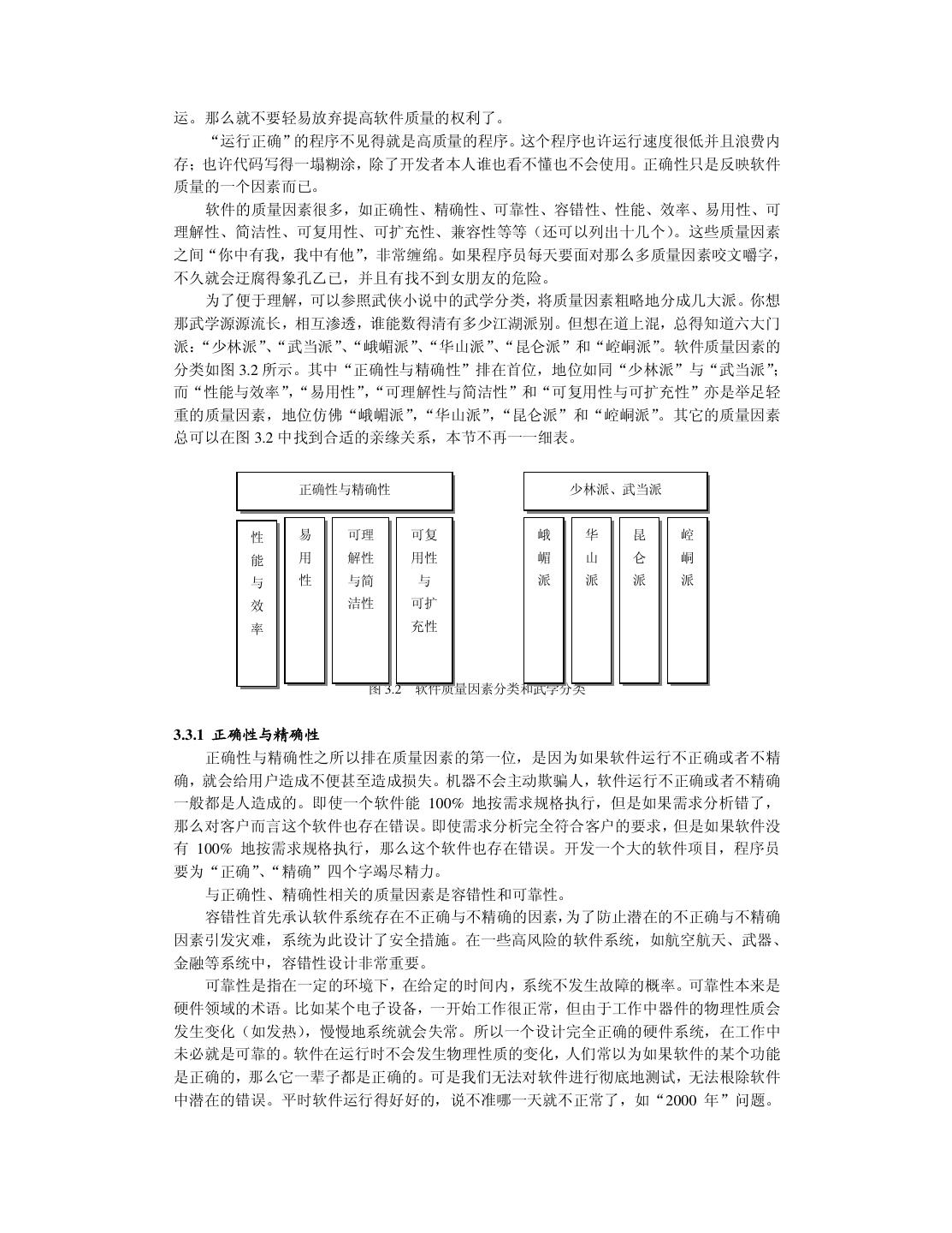 25 .运。那么就不要轻易放弃提高软件质量的权利了。 “运行正确”的程序不见得就是高质量的程序。这个程序也许运行速度很低并且浪费内 存;也许代码写得一塌糊涂,除了开发者本人谁也看不懂也不会使用。正确性只是反映软件 质量的一个因素而已。 软件的质量因素很多,如正确性、精确性、可靠性、容错性、性能、效率、易用性、可 理解性、简洁性、可复用性、可扩充性、兼容性等等(还可以列出十几个)。这些质量因素 之间“你中有我,我中有他”,非常缠绵。如果程序员每天要面对那么多质量因素咬文嚼字, 不久就会迂腐得象孔乙已,并且有找不到女朋友的危险。 为了便于理解,可以参照武侠小说中的武学分类,将质量因素粗略地分成几大派。你想 那武学源源流长,相互渗透,谁能数得清有多少江湖派别。但想在道上混,总得知道六大门 派:“少林派” 、“武当派” 、“峨嵋派”、 “华山派”、“昆仑派”和“崆峒派”。软件质量因素的 分类如图 3.2 所示。其中“正确性与精确性”排在首位,地位如同“少林派”与“武当派” ; 而“性能与效率” , “易用性”, “可理解性与简洁性”和“可复用性与可扩充性”亦是举足轻 重的质量因素,地位仿佛“峨嵋派” ,“华山派”,“昆仑派”和“崆峒派” 。其它的质量因素 总可以在图 3.2 中找到合适的亲缘关系,本节不再一一细表。 正确性与精确性 少林派、武当派 性 易 可理 可复 峨 华 昆 崆 能 用 解性 用性 嵋 山 仑 峒 与 性 与简 与 派 派 派 派 效 洁性 可扩 率 充性 图 3.2 软件质量因素分类和武学分类 3.3.1 正确性与精确性 正确性与精确性之所以排在质量因素的第一位,是因为如果软件运行不正确或者不精 确,就会给用户造成不便甚至造成损失。机器不会主动欺骗人,软件运行不正确或者不精确 一般都是人造成的。即使一个软件能 100% 地按需求规格执行,但是如果需求分析错了, 那么对客户而言这个软件也存在错误。即使需求分析完全符合客户的要求,但是如果软件没 有 100% 地按需求规格执行,那么这个软件也存在错误。开发一个大的软件项目,程序员 要为“正确” 、“精确”四个字竭尽精力。 与正确性、精确性相关的质量因素是容错性和可靠性。 容错性首先承认软件系统存在不正确与不精确的因素,为了防止潜在的不正确与不精确 因素引发灾难,系统为此设计了安全措施。在一些高风险的软件系统,如航空航天、武器、 金融等系统中,容错性设计非常重要。 可靠性是指在一定的环境下,在给定的时间内,系统不发生故障的概率。可靠性本来是 硬件领域的术语。比如某个电子设备,一开始工作很正常,但由于工作中器件的物理性质会 发生变化(如发热),慢慢地系统就会失常。所以一个设计完全正确的硬件系统,在工作中 未必就是可靠的。软件在运行时不会发生物理性质的变化,人们常以为如果软件的某个功能 是正确的,那么它一辈子都是正确的。可是我们无法对软件进行彻底地测试,无法根除软件 中潜在的错误。平时软件运行得好好的,说不准哪一天就不正常了,如“2000 年”问题。