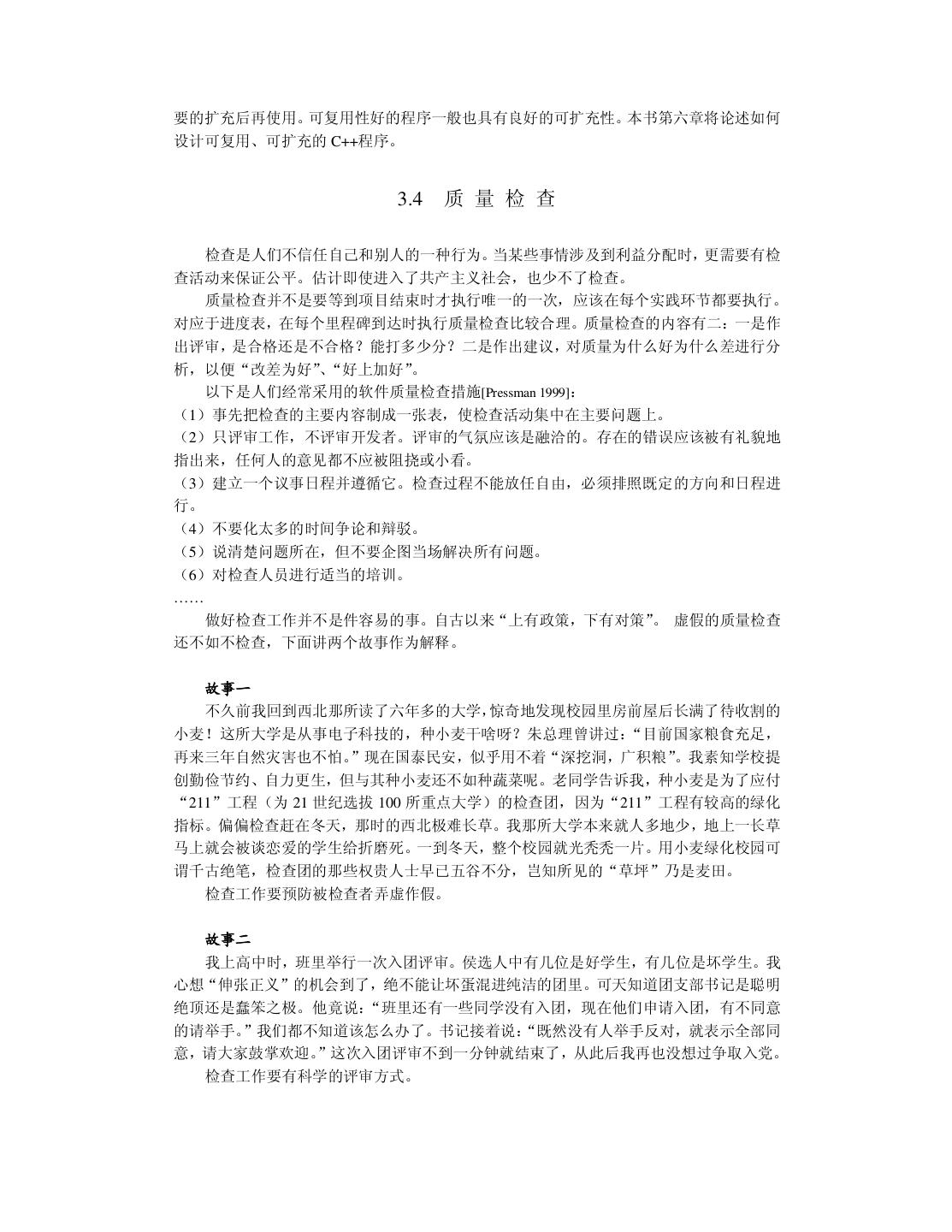 27 .要的扩充后再使用。可复用性好的程序一般也具有良好的可扩充性。本书第六章将论述如何 设计可复用、可扩充的 C++程序。 3.4 质 量 检 查 检查是人们不信任自己和别人的一种行为。当某些事情涉及到利益分配时,更需要有检 查活动来保证公平。估计即使进入了共产主义社会,也少不了检查。 质量检查并不是要等到项目结束时才执行唯一的一次,应该在每个实践环节都要执行。 对应于进度表,在每个里程碑到达时执行质量检查比较合理。质量检查的内容有二:一是作 出评审,是合格还是不合格?能打多少分?二是作出建议,对质量为什么好为什么差进行分 析,以便“改差为好”、“好上加好” 。 以下是人们经常采用的软件质量检查措施[Pressman 1999]: (1)事先把检查的主要内容制成一张表,使检查活动集中在主要问题上。 (2)只评审工作,不评审开发者。评审的气氛应该是融洽的。存在的错误应该被有礼貌地 指出来,任何人的意见都不应被阻挠或小看。 (3)建立一个议事日程并遵循它。检查过程不能放任自由,必须排照既定的方向和日程进 行。 (4)不要化太多的时间争论和辩驳。 (5)说清楚问题所在,但不要企图当场解决所有问题。 (6)对检查人员进行适当的培训。 …… 做好检查工作并不是件容易的事。自古以来“上有政策,下有对策”。 虚假的质量检查 还不如不检查,下面讲两个故事作为解释。 故事一 不久前我回到西北那所读了六年多的大学,惊奇地发现校园里房前屋后长满了待收割的 小麦!这所大学是从事电子科技的,种小麦干啥呀?朱总理曾讲过:“目前国家粮食充足, 再来三年自然灾害也不怕。”现在国泰民安,似乎用不着“深挖洞,广积粮” 。我素知学校提 创勤俭节约、自力更生,但与其种小麦还不如种蔬菜呢。老同学告诉我,种小麦是为了应付 “211”工程(为 21 世纪选拔 100 所重点大学)的检查团,因为“211”工程有较高的绿化 指标。偏偏检查赶在冬天,那时的西北极难长草。我那所大学本来就人多地少,地上一长草 马上就会被谈恋爱的学生给折磨死。一到冬天,整个校园就光秃秃一片。用小麦绿化校园可 谓千古绝笔,检查团的那些权贵人士早已五谷不分,岂知所见的“草坪”乃是麦田。 检查工作要预防被检查者弄虚作假。 故事二 我上高中时,班里举行一次入团评审。侯选人中有几位是好学生,有几位是坏学生。我 心想“伸张正义”的机会到了,绝不能让坏蛋混进纯洁的团里。可天知道团支部书记是聪明 绝顶还是蠢笨之极。他竟说:“班里还有一些同学没有入团,现在他们申请入团,有不同意 的请举手。”我们都不知道该怎么办了。书记接着说: “既然没有人举手反对,就表示全部同 意,请大家鼓掌欢迎。”这次入团评审不到一分钟就结束了,从此后我再也没想过争取入党。 检查工作要有科学的评审方式。