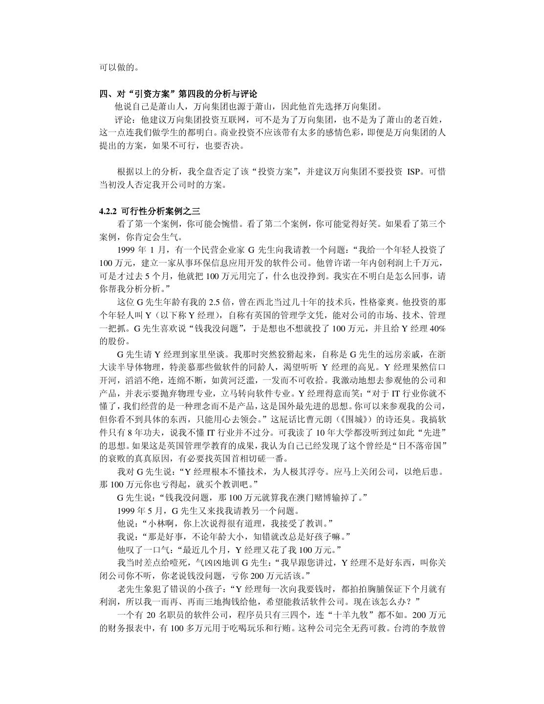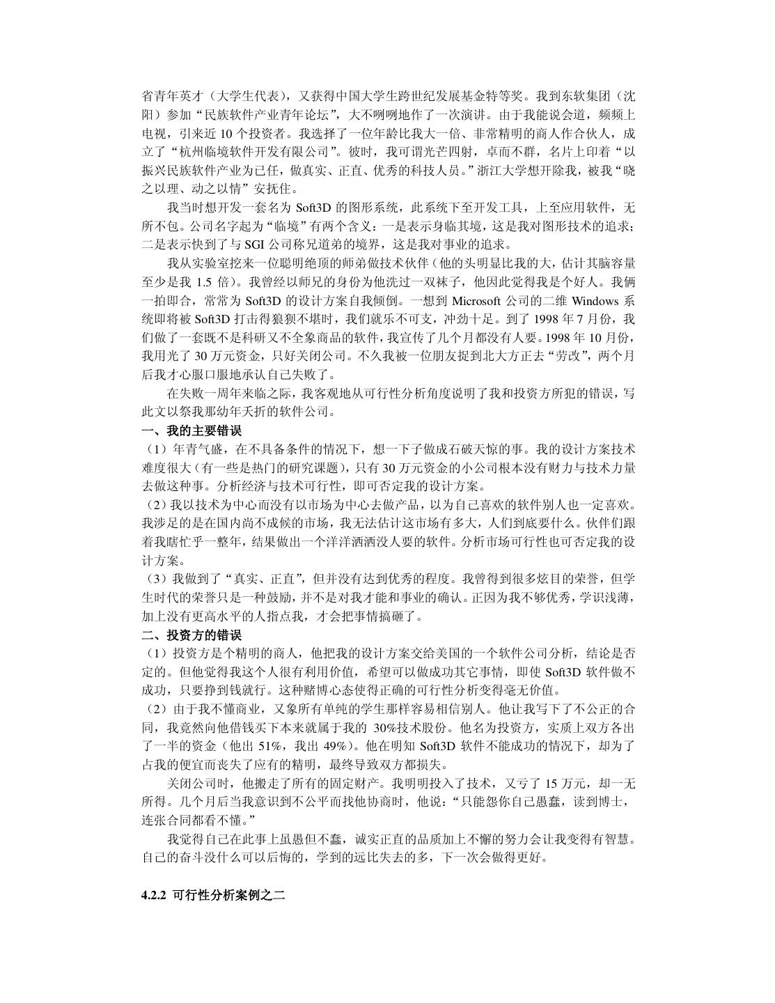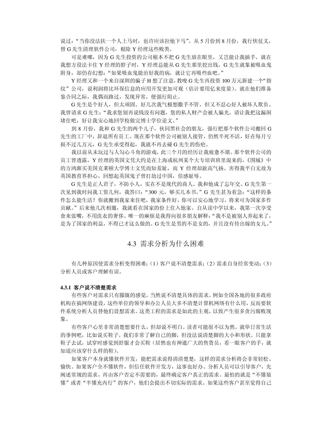 29 . 第四章 可行性分析与需求分析 可行性分析是要决定“做还是不做”。 需求分析是要决定“做什么,不做什么”。 即使可行性分析是客观的、科学的,但决策仍有可能是错误的。因为决策者是人,人会 冲动,有赌博心态。如果可行性分析表明做某件事的成功率是 10%,失败率是 90%,倘若 该事情的意义非常大,决策者也许会一拍脑袋:“豁出去,干!”于是这世界就多了一份极喜 与极悲。4.1 节讲述可行性分析的四大要素:经济、技术、社会环境和人。 目前国内很多软件公司做系统集成项目,如果谈谈系统集成项目的可行性分析将很有意 思。可是那些系统集成项目大多是政府机构的,由于软件行业尚不规范并且客户方存在腐败 现象,所以业内流传“没有做不了的系统集成项目” 。软件公司的注意力几乎全集中在“如 何拿到项目订单”以及“拿到订单后如何蒙混过关”上,使我丧失了卖弄“可行性分析”的 机会。既然不能正面指点一个人如何做好事,那么就规劝他不要做坏事吧。 4.2 节讲述可行性分析案例——投资软件公司失败的教训。作者本来没有资格谈论投资, 但事有凑巧:近一年来我关闭了一个亏损 30 万元的软件公司(我自己的);休克一个年亏损 200 万元的软件公司(朋友的) ;扼杀一个 200 万元的投资方案(陌生人的) ;踩灭一个处于 萌芽状态的 100 万元的投资设想(熟人的) 。鉴于现在比较富有的民营企业渴望投资软件行 业的越来越多,值得谈谈这方面的可行性分析。我将讲述亲身经历后的感受,提一些建议。 不论是为客户做软件项目还是为自己做软件产品,都要进行需求分析。需求分析最恼人 之处是难以在项目刚启动时搞清楚需求,如果在项目做了一大半时需求发生了变化,那将使 项目陷入困境。4.3 节解释需求分析为什么困难,4.4 节讲述如何进行需求分析。本章的需求 分析均不涉及编程,所以不考虑结构化、面向对象等分析方法。 4.1 可行性分析的要素 做可行性分析不能以偏盖全,也不可以什么鸡毛蒜皮的细节都加以权衡。可行性分析必 须为决策提供有价值的证据。 联想集团领导人柳传志曾说:“没钱赚的事我们不干;有钱赚但投不起钱的事不干;有 钱赚也投得起钱但没有可靠的人选,这样的事也不干。”柳传志为决策立了上述准则,同时 也为可以行性分析指明了重点。 一般地,软件领域的可行性分析主要考虑四个要素:经济、技术、社会环境和人。本节 只是泛泛地解释这四个要素,旨在建立全局分析的观念。4.2 节将结合案例围绕上述要素进 行重点分析与评注。 4.1.1 经济 经济可行性分析主要包括:“成本——收益”分析和“短期——长远利益”分析。 一、成本——收益分析 成本——收益分析最容易理解,如果成本高于收益则表明亏损了,如果成本大大高于收 益那就亏大了。商人都不喜欢做吃亏的事情。有些商店成天贴着“最后一天跳楼大拍卖”的 标语,意思是:我准备吃大亏让你占便宜,同志,你快上钩吧。
