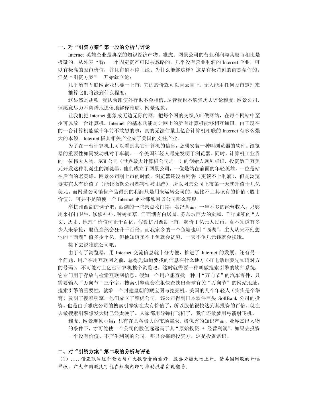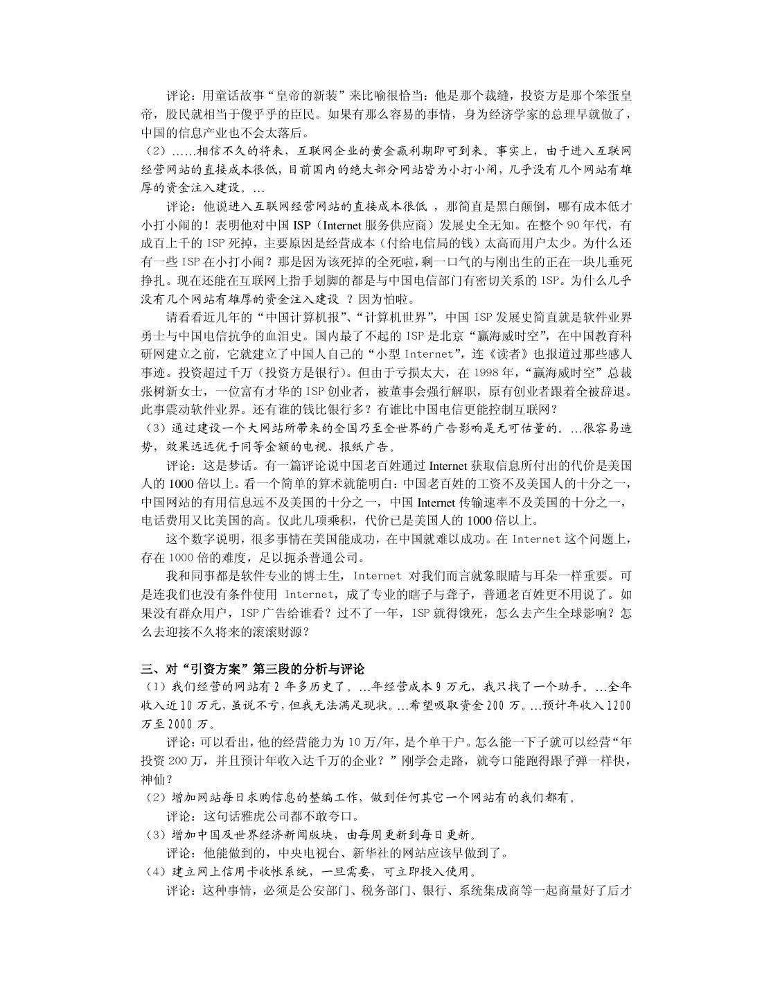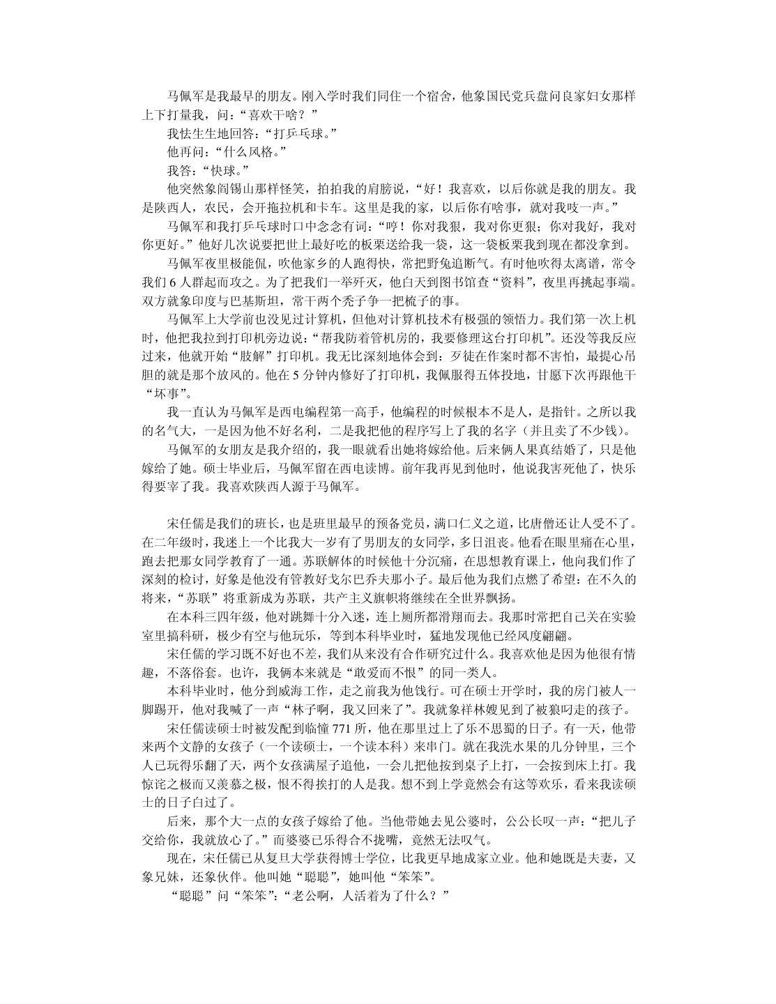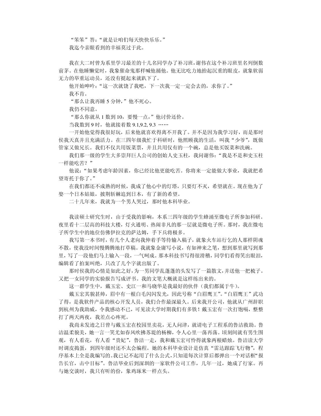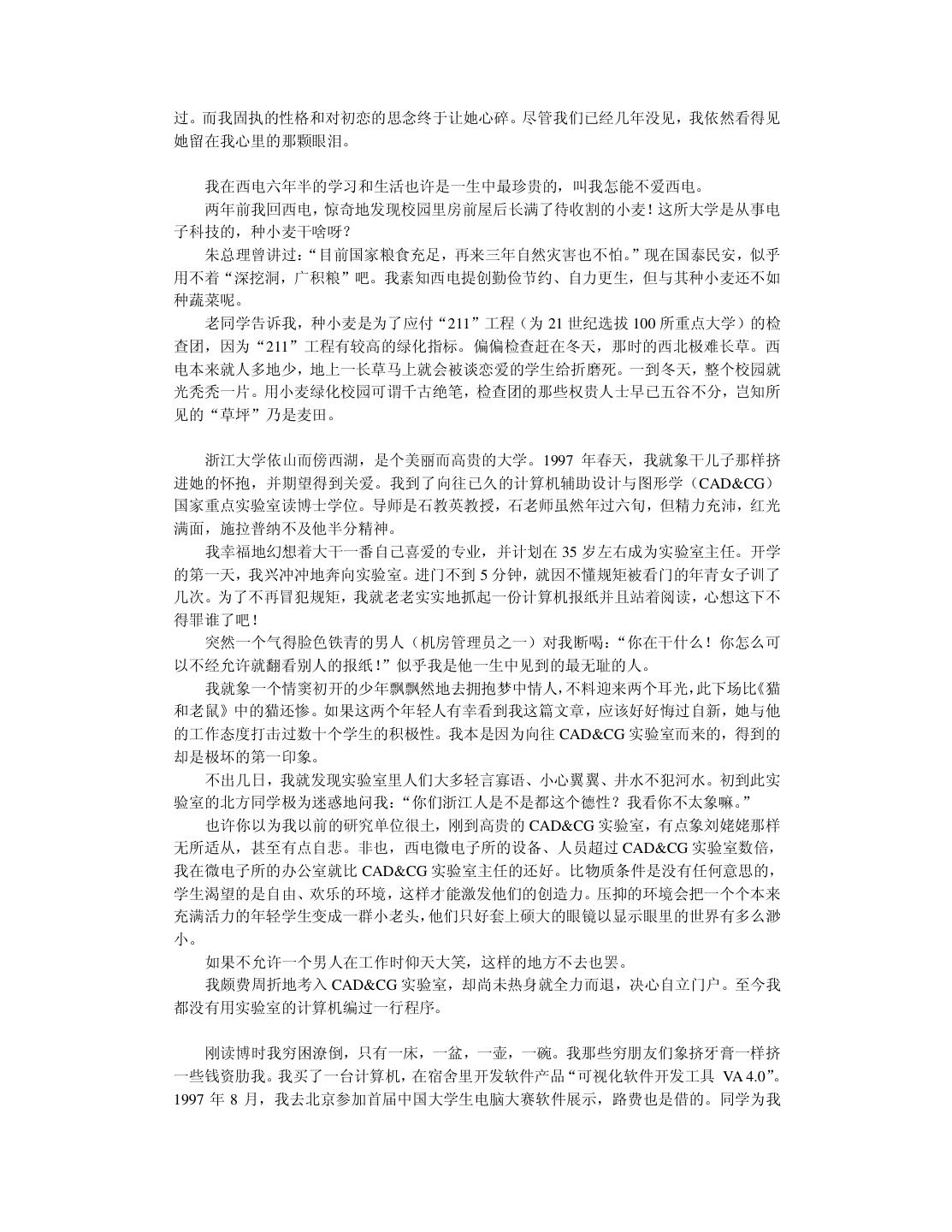 4 . 致 谢 本书并不属于我博士学位论文的研究范畴,但却是我读博士学位三年来写的最有意思的 作品。 首先要感谢我的导师,浙江大学计算机辅助设计与图形学(CAD&CG)国家重点实验 室的石教英教授。在其他师兄弟正儿八经地“攻读”博士学位时,我“不务正业”地开了一 家软件公司。当我摔了一个大跟头灰溜溜地回到陌生的实验室时,石老师仍然热情地帮助我 “修成正果”。临近毕业,我心中惭愧,三年来我从来都没给石老师干过活,我这个博士生 他算是白招了。我很希望大学里多一些象石老师那样开明而大度的导师。 董军博士是本书的第一位读者。我们是“君子之交”却不“淡如水”,除了漆夜长谈科 技、艺术、哲学外,还不忘“吃喝玩乐”享受生活。他在品阅的同时完成了审稿工作。 北京因特国风网络软件公司的周鸿一是个真正的软件高手。他在我开发软件产品失败时 给予了最多的帮助,并指正我在软件设计中存在的根深蒂固的方法错误,使我能尽早地逐步 改正。我平时能说会道,但在他面前我哑口无言只有听的份,因为他的才华已全方位地超过 了我。我真希望多结识象他这样的朋友。 高振华老先生是个糊涂而可爱的民营企业家,我们是忘年交。我把他干的糊涂事(投资 软件公司)写进书里,作为可行性分析的案例。高先生给予我经济上的帮助,使我能够在舒 适的环境中开展最后一年博士学位论文工作。尽管我读书的工资每月只有 300 元,但日子过 得象神仙一样舒服。 浙江大学计算机系的杨孟洲、周昆、曾震宇、杨建、白云、金锋等同学和我合作开发软 件,给了我很多技术上的帮助。我对他们深表感谢。 特别感谢父母给我起了很好听的名字。读了十年大学,现在我差不多名副其实了。 林锐,2000 年 2 月 于浙江大学 CAD&CG 国家重点实验室
