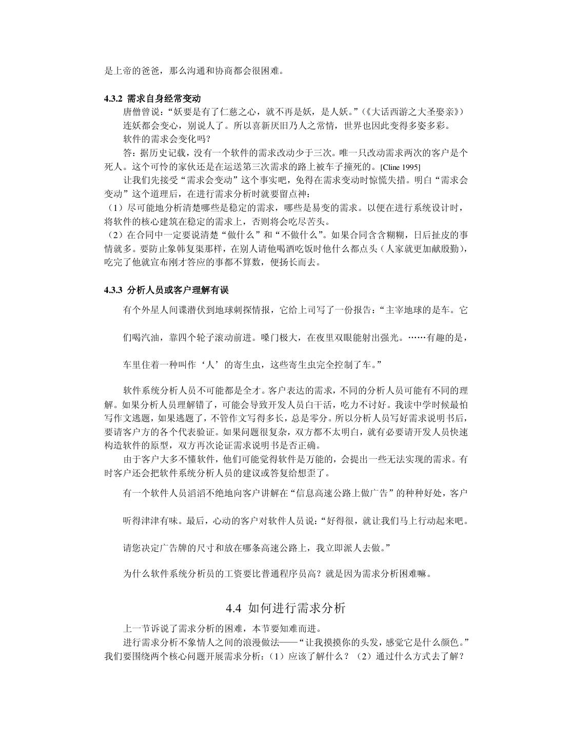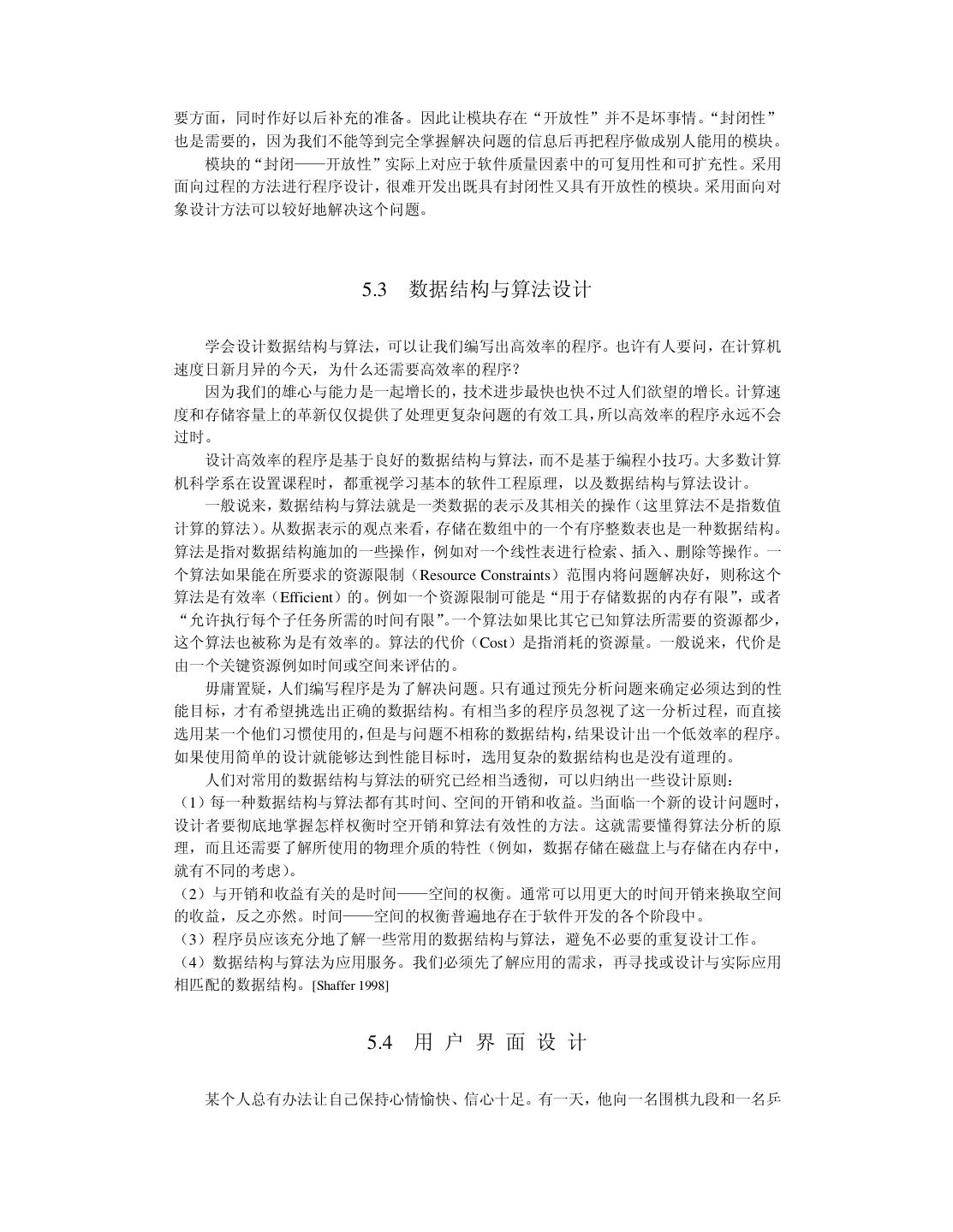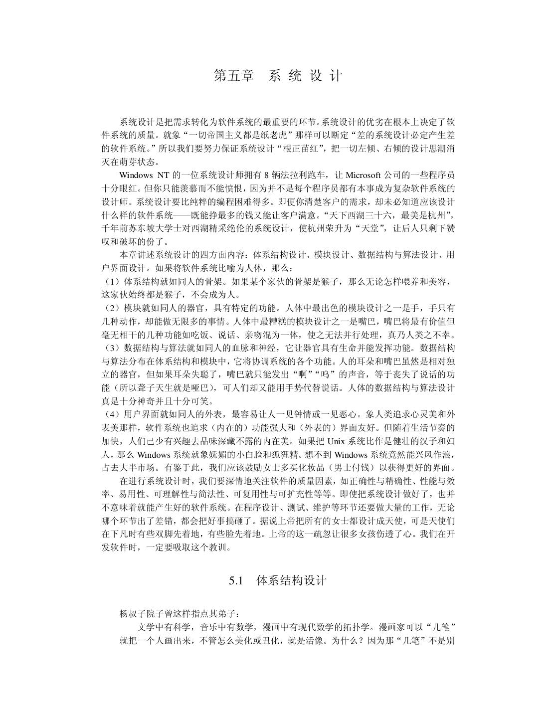 26 .因此把可靠性引入软件领域是有意义的。我曾买了一本关于软件可靠性的著作,此书充满了 数学公式。我发现以我目前的学历实在难以看懂书上讲了些什么。请宽恕我的愚昧,我把此 书给“供”起来,没敢用笔画一处记号。 3.3.2 性能与效率 用户都希望软件的运行速度高些(高性能) ,并且占用资源少些(高效率)。旧社会地主 就是这么对待长工的:干活要快点,吃得要少点。程序员可以通过优化算法、数据结构和代 码组织来提高软件系统的性能与效率。优化的关键工作是找出限制性能与效率的“瓶颈”, 不要在无关痛痒的地方瞎忙乎。如果你想职称升得快,光靠增加课时能顶屁用;你就该一年 写它几十篇文章,争取破格升教授。 3.3.3 易用性 易用性是指用户感觉使用软件的难易程度。用户可能是操作软件的最终用户,也可能是 那些要使用源代码的程序员。现代人的生活节奏快,干啥事都想图个方便。所以把易用性作 为重要的质量因素无可非议。 导致软件易用性差的根本原因是开发人员犯了“错位”的毛病:他以为只要自己用起来 方便,用户也一定会满意。俗话说“王婆卖瓜,自卖自夸”。当程序员向用户展示软件时, 常会得意地讲: “这个软件非常好用,我操作给你看,……是很好用吧!”软件的易用性要让 用户来评价。当用户真的感到软件很好用时,一股温暖的感觉油然而生,于是就用“友好” 来评价易用性。 3.3.4 可理解性与简洁性 可理解性表达了人们一种质朴的愿望:我化钱买了它,总得让我明白它是什么东西。我 小时候的一个伙伴在读中学时,就因无法理解电荷之分正负,觉得很烦恼,便早早地缀学当 工人。 可理解性也是对用户而言的。开发人员只有在自己思路清晰时才可能写出让别人能理解 的程序。编程时还要注意不可滥用技巧,应该用自然的方式编程。我们的确不知道自己的得 意之举究竟是锦上添花,还是画蛇添足。就象蒸出一笼馒头,在上面插一朵鲜花,本想弄点 诗情画意,却让人误以为那是一堆热气腾腾的牛粪。 简洁是一种美,不管是自己还是用户都会有同感。在生活中,与简洁对立的是“罗里罗 嗦”。中国小说中最“婆婆妈妈”的男人是唐僧。有一项民意调查:如果世上只有唐僧、孙 悟空、猪八戒和沙僧这四类男人,你要嫁给哪一类?请列出优先级。调查结果表明,现代女 性毫不例外地把唐僧摆在老末。 一个原始的应用问题可能很复杂,但高水平的人就能够把软件系统设计得很简洁。如果 软件系统臃肿不堪,它迟早会出问题。简洁是人们对工作“精益求精”的结果。 废话大师有句名言:“如果我令你过于轻松地明白了,那你一定是误解了我说的话。”我 最近有一种奇怪的体会:如果把学术文章写得很简洁,让人很容易理解,它往往中不了;只 有加上一些玄乎的东西,把本来简单的弄成复杂的,才会增加投稿的命中率。事实上,我可 以在 5 分钟之内说清楚三年来读博所做的工作,根本用不着写 100 多页的博士论文。我是在 临近毕业时,才发觉自己完全不适合读博士学位。将来工作后,我一定要好好编程,重新做 人。 3.3.5 可复用性与可扩充性 复用的一种方式是原封不动地使用现成的软构件, 另一种方式是对现成的软构件进行必
