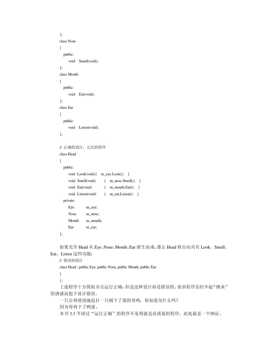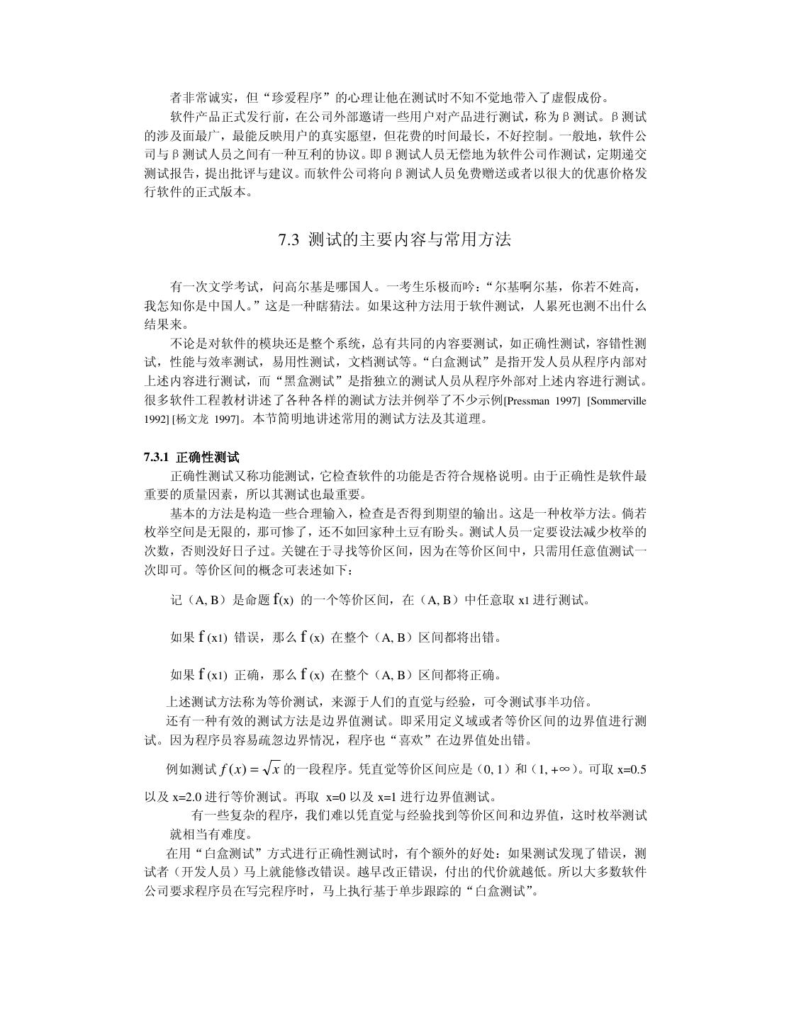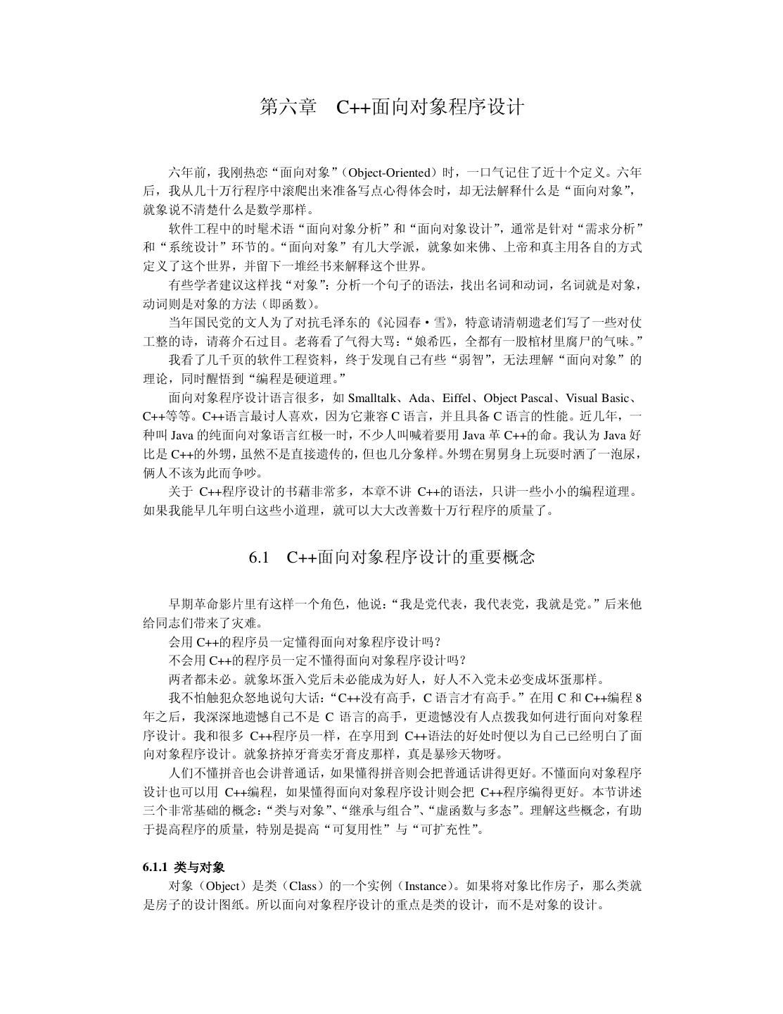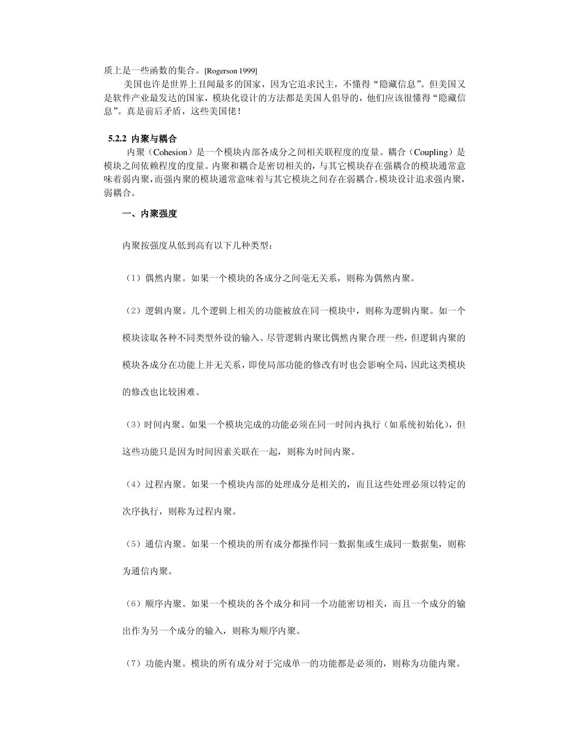 26 .因此把可靠性引入软件领域是有意义的。我曾买了一本关于软件可靠性的著作,此书充满了 数学公式。我发现以我目前的学历实在难以看懂书上讲了些什么。请宽恕我的愚昧,我把此 书给“供”起来,没敢用笔画一处记号。 3.3.2 性能与效率 用户都希望软件的运行速度高些(高性能) ,并且占用资源少些(高效率)。旧社会地主 就是这么对待长工的:干活要快点,吃得要少点。程序员可以通过优化算法、数据结构和代 码组织来提高软件系统的性能与效率。优化的关键工作是找出限制性能与效率的“瓶颈”, 不要在无关痛痒的地方瞎忙乎。如果你想职称升得快,光靠增加课时能顶屁用;你就该一年 写它几十篇文章,争取破格升教授。 3.3.3 易用性 易用性是指用户感觉使用软件的难易程度。用户可能是操作软件的最终用户,也可能是 那些要使用源代码的程序员。现代人的生活节奏快,干啥事都想图个方便。所以把易用性作 为重要的质量因素无可非议。 导致软件易用性差的根本原因是开发人员犯了“错位”的毛病:他以为只要自己用起来 方便,用户也一定会满意。俗话说“王婆卖瓜,自卖自夸”。当程序员向用户展示软件时, 常会得意地讲: “这个软件非常好用,我操作给你看,……是很好用吧!”软件的易用性要让 用户来评价。当用户真的感到软件很好用时,一股温暖的感觉油然而生,于是就用“友好” 来评价易用性。 3.3.4 可理解性与简洁性 可理解性表达了人们一种质朴的愿望:我化钱买了它,总得让我明白它是什么东西。我 小时候的一个伙伴在读中学时,就因无法理解电荷之分正负,觉得很烦恼,便早早地缀学当 工人。 可理解性也是对用户而言的。开发人员只有在自己思路清晰时才可能写出让别人能理解 的程序。编程时还要注意不可滥用技巧,应该用自然的方式编程。我们的确不知道自己的得 意之举究竟是锦上添花,还是画蛇添足。就象蒸出一笼馒头,在上面插一朵鲜花,本想弄点 诗情画意,却让人误以为那是一堆热气腾腾的牛粪。 简洁是一种美,不管是自己还是用户都会有同感。在生活中,与简洁对立的是“罗里罗 嗦”。中国小说中最“婆婆妈妈”的男人是唐僧。有一项民意调查:如果世上只有唐僧、孙 悟空、猪八戒和沙僧这四类男人,你要嫁给哪一类?请列出优先级。调查结果表明,现代女 性毫不例外地把唐僧摆在老末。 一个原始的应用问题可能很复杂,但高水平的人就能够把软件系统设计得很简洁。如果 软件系统臃肿不堪,它迟早会出问题。简洁是人们对工作“精益求精”的结果。 废话大师有句名言:“如果我令你过于轻松地明白了,那你一定是误解了我说的话。”我 最近有一种奇怪的体会:如果把学术文章写得很简洁,让人很容易理解,它往往中不了;只 有加上一些玄乎的东西,把本来简单的弄成复杂的,才会增加投稿的命中率。事实上,我可 以在 5 分钟之内说清楚三年来读博所做的工作,根本用不着写 100 多页的博士论文。我是在 临近毕业时,才发觉自己完全不适合读博士学位。将来工作后,我一定要好好编程,重新做 人。 3.3.5 可复用性与可扩充性 复用的一种方式是原封不动地使用现成的软构件, 另一种方式是对现成的软构件进行必