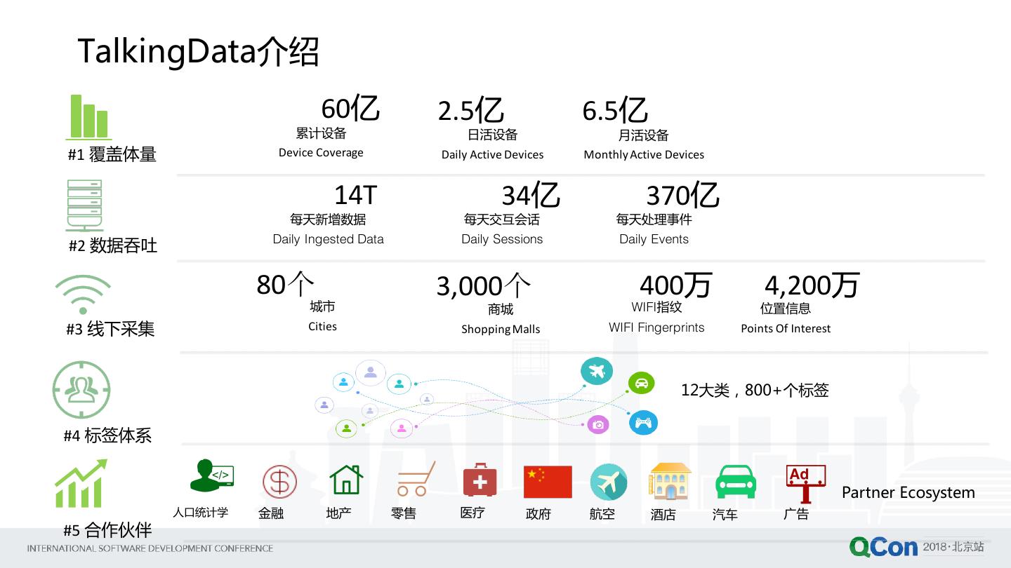 3 . TalkingData介绍 60亿 2.5亿 6.5亿 累计设备 日活设备 月活设备 #1 覆盖体量 Device Coverage Daily Active Devices Monthly Active Devices 14T 34亿 370亿 每天新增数据 每天交互会话 每天处理事件 Daily Ingested Data Daily Sessions Daily Events #2 数据吞吐 80个 3,000个 400万 4,200万 城市 商城 WIFI指纹 位置信息 #3 线下采集 Cities Shopping Malls WIFI Fingerprints Points Of Interest 12大类,800+个标签 #4 标签体系 Partner Ecosystem 人口统计学 金融 地产 零售 医疗 政府 航空 酒店 汽车 广告 #5 合作伙伴