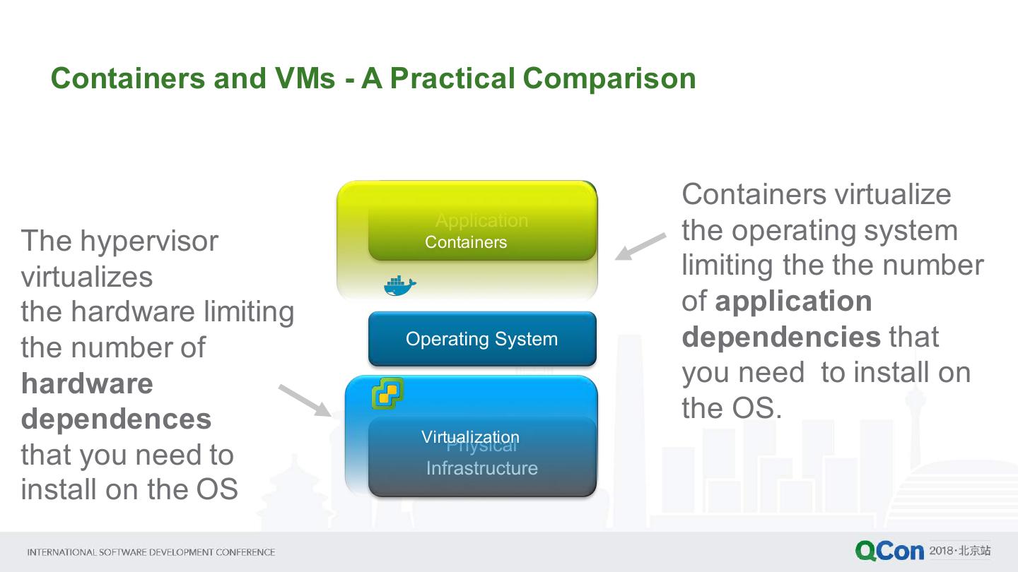 5 . Containers and VMs - A Practical Comparison Containers virtualize Application The hypervisor Containers the operating system virtualizes limiting the the number the hardware limiting of application the number of Operating System dependencies that hardware you need to install on dependences the OS. Virtualization Physical that you need to Infrastructure install on the OS