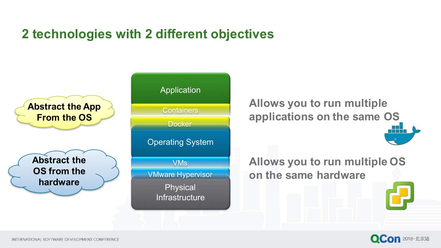 6 .2 technologies with 2 different objectives Application Abstract the App Allows you to run multiple Containers From the OS applications on the same OS Docker Operating System Abstract the VMs Allows you to run multiple OS OS from the VMware Hypervisor on the same hardware hardware Physical Infrastructure