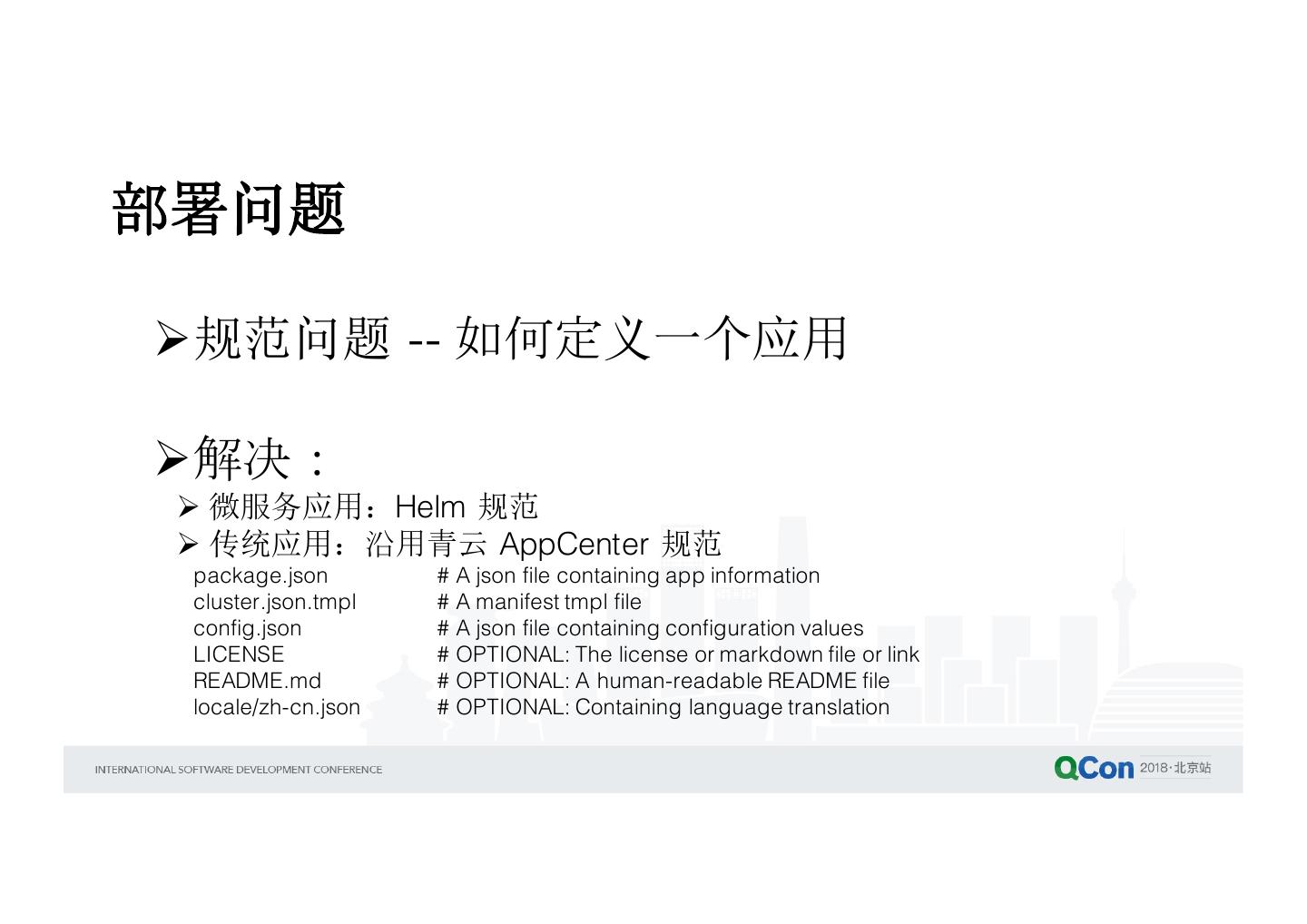 14 .部署问题 Ø规范问题 -- 如何定义一个应用 Ø解决: Ø 微服务应用:Helm 规范 Ø 传统应用:沿用青云 AppCenter 规范 package.json # A json file containing app information cluster.json.tmpl # A manifest tmpl file config.json # A json file containing configuration values LICENSE # OPTIONAL: The license or markdown file or link README.md # OPTIONAL: A human-readable README file locale/zh-cn.json # OPTIONAL: Containing language translation