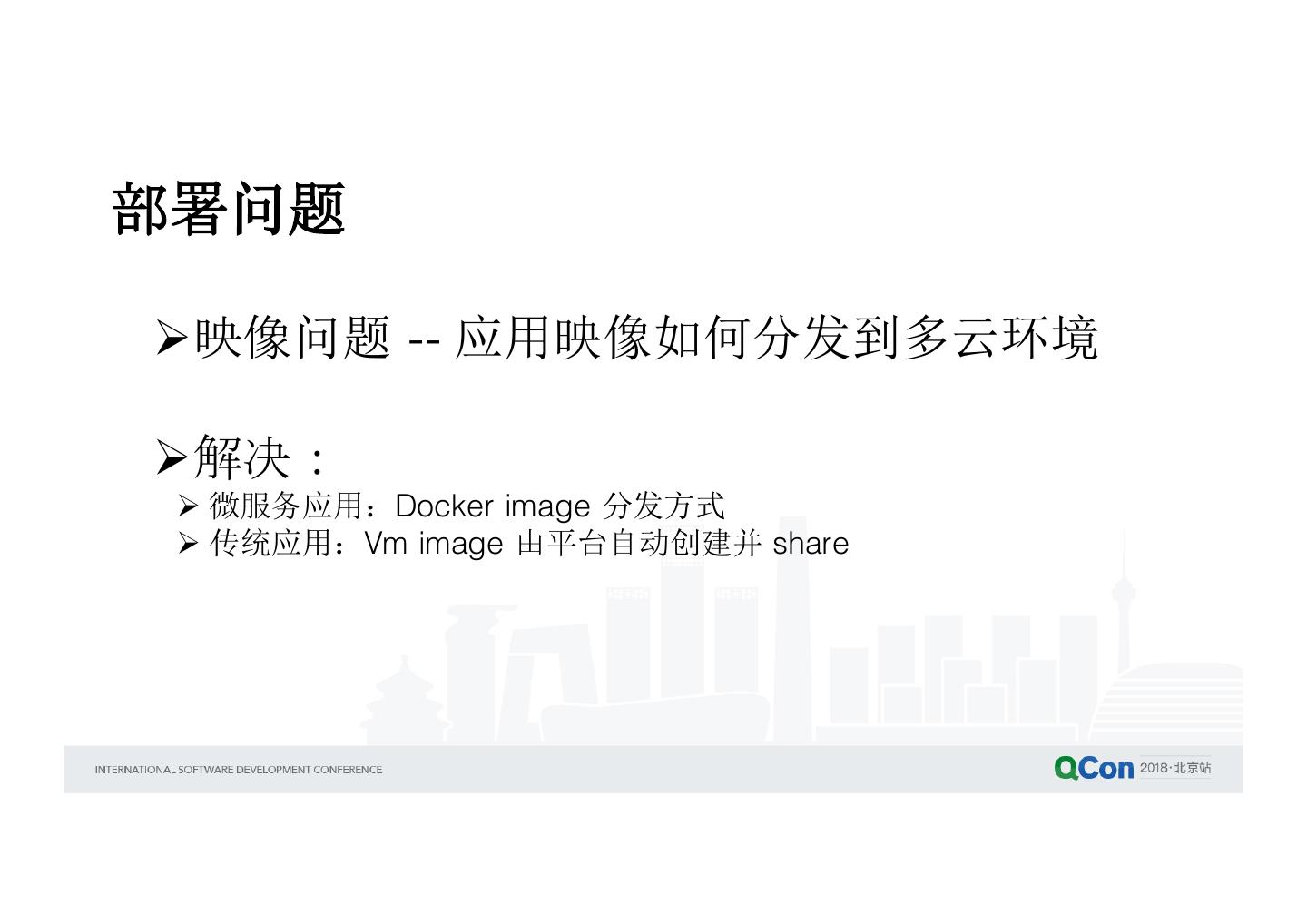 17 .部署问题 Ø映像问题 -- 应用映像如何分发到多云环境 Ø解决: Ø 微服务应用:Docker image 分发方式 Ø 传统应用:Vm image 由平台自动创建并 share