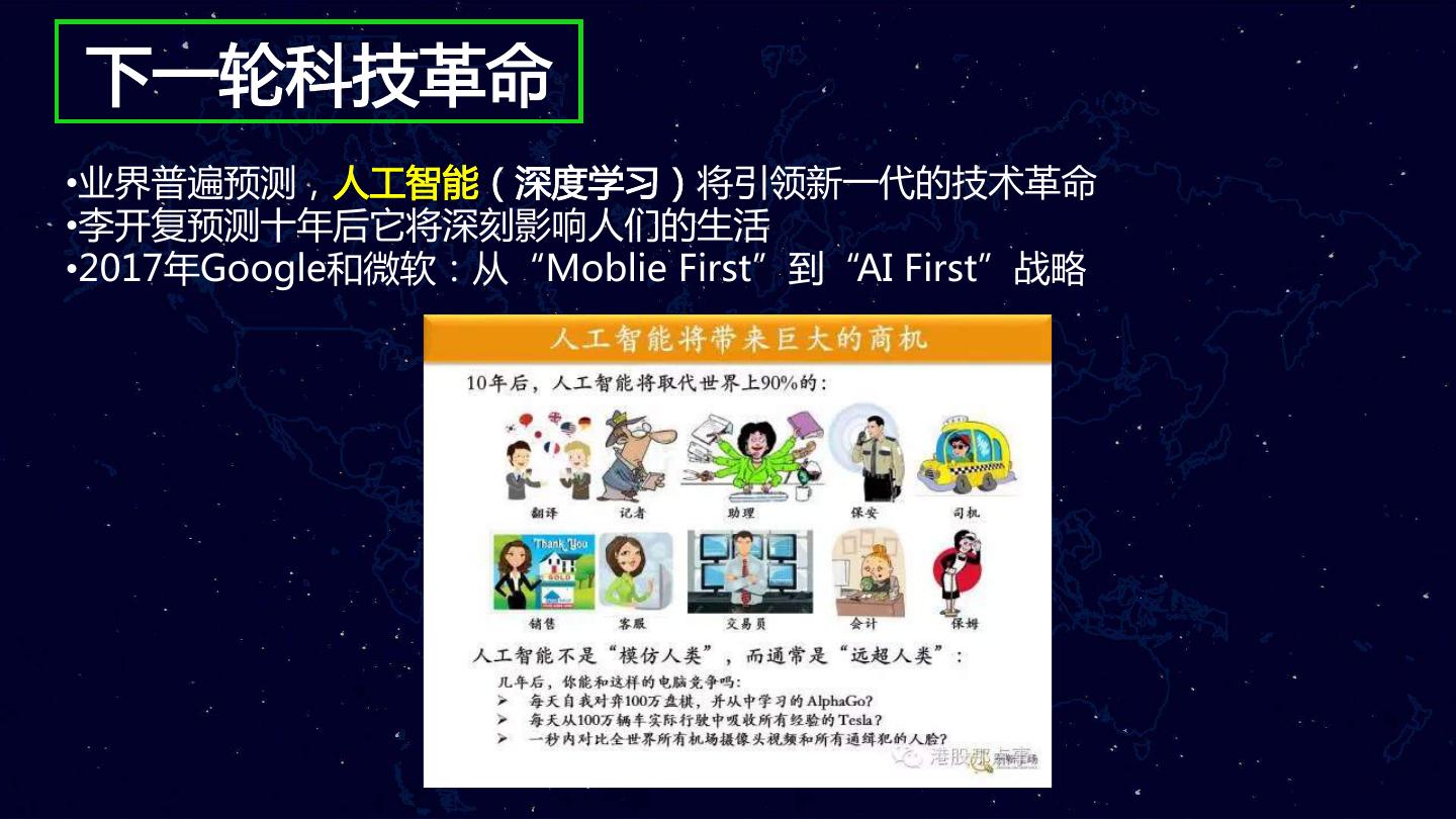 5 .下一轮科技革命 • 业界普遍预测,人工智能(深度学习)将引领新一代的技术革命 • 李开复预测十年后它将深刻影响人们的生活 • 2017年Google和微软:从“Moblie First”到“AI First”战略