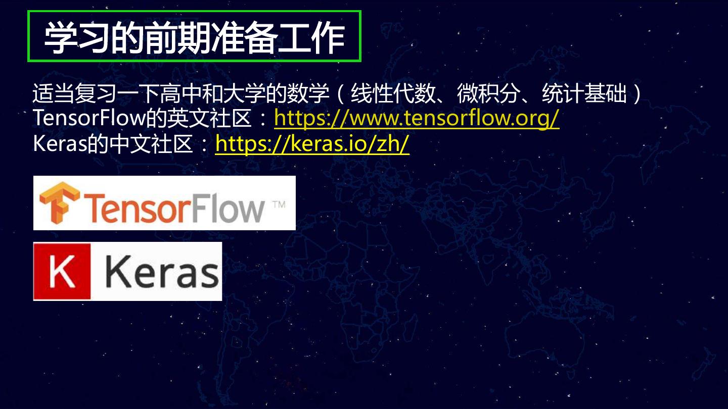 14 .学习的前期准备工作 适当复习一下高中和大学的数学(线性代数、微积分、统计基础) TensorFlow的英文社区:https://www.tensorflow.org/ Keras的中文社区:https://keras.io/zh/
