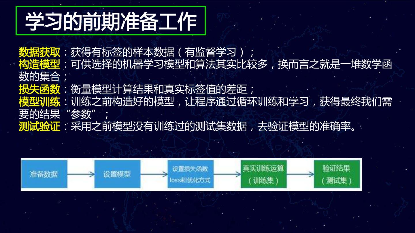 15 .学习的前期准备工作 数据获取:获得有标签的样本数据(有监督学习); 构造模型:可供选择的机器学习模型和算法其实比较多,换而言之就是一堆数学函 数的集合; 损失函数:衡量模型计算结果和真实标签值的差距; 模型训练:训练之前构造好的模型,让程序通过循环训练和学习,获得最终我们需 要的结果“参数”; 测试验证:采用之前模型没有训练过的测试集数据,去验证模型的准确率。