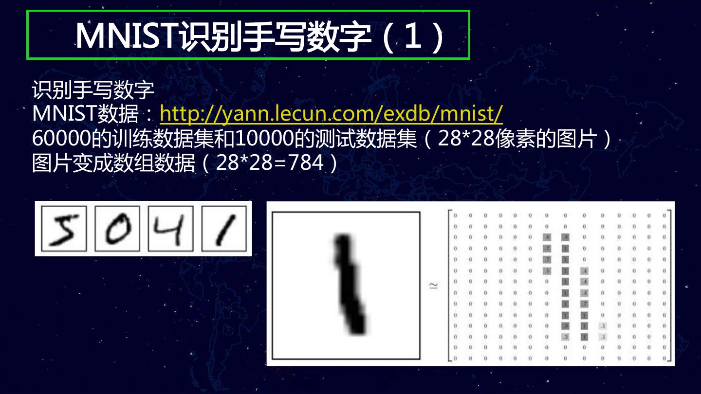 16 . MNIST识别手写数字(1) 识别手写数字 MNIST数据:http://yann.lecun.com/exdb/mnist/ 60000的训练数据集和10000的测试数据集(28*28像素的图片) 图片变成数组数据(28*28=784)