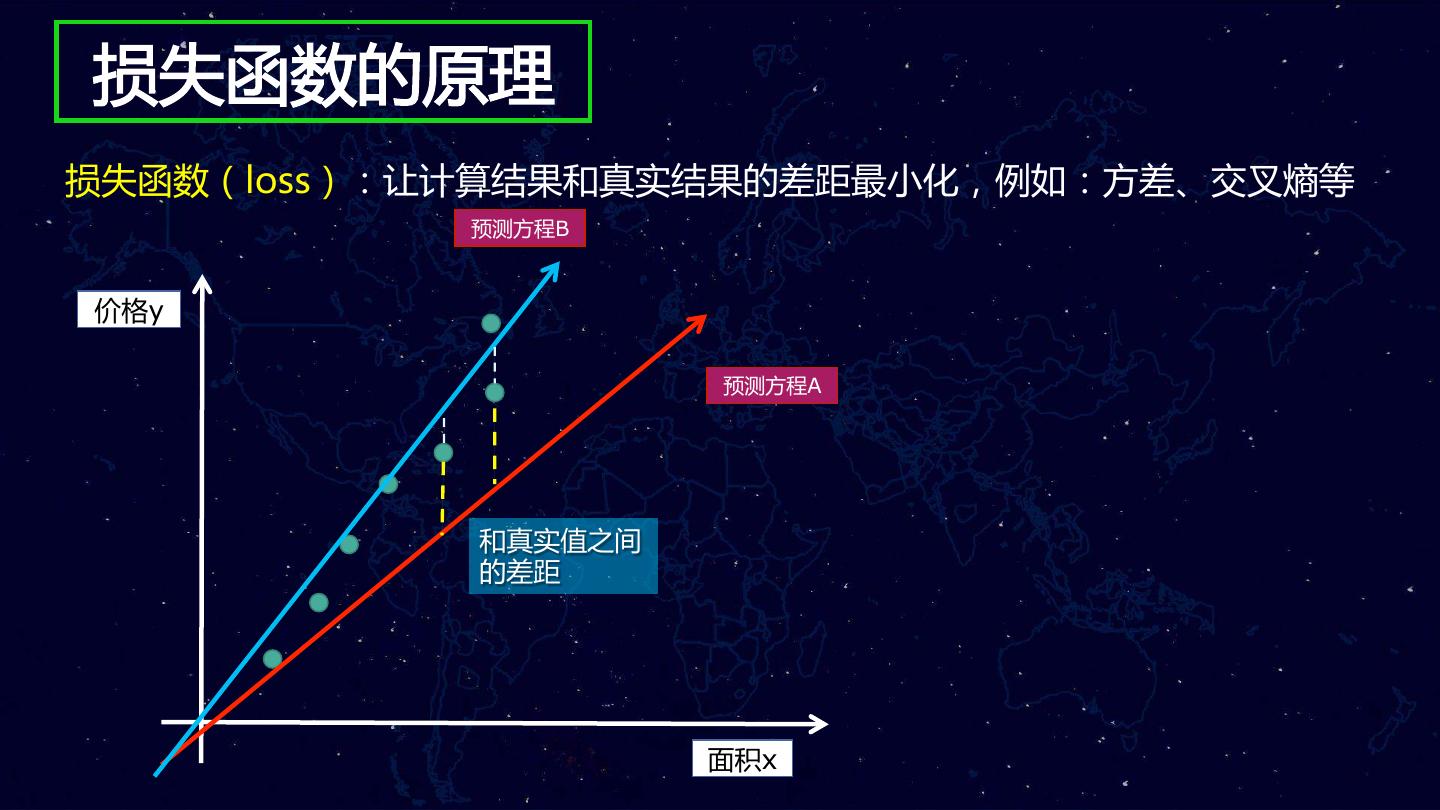 18 .损失函数的原理 损失函数(loss):让计算结果和真实结果的差距最小化,例如:方差、交叉熵等 预测方程B 价格y 预测方程A 和真实值之间 的差距 面积x