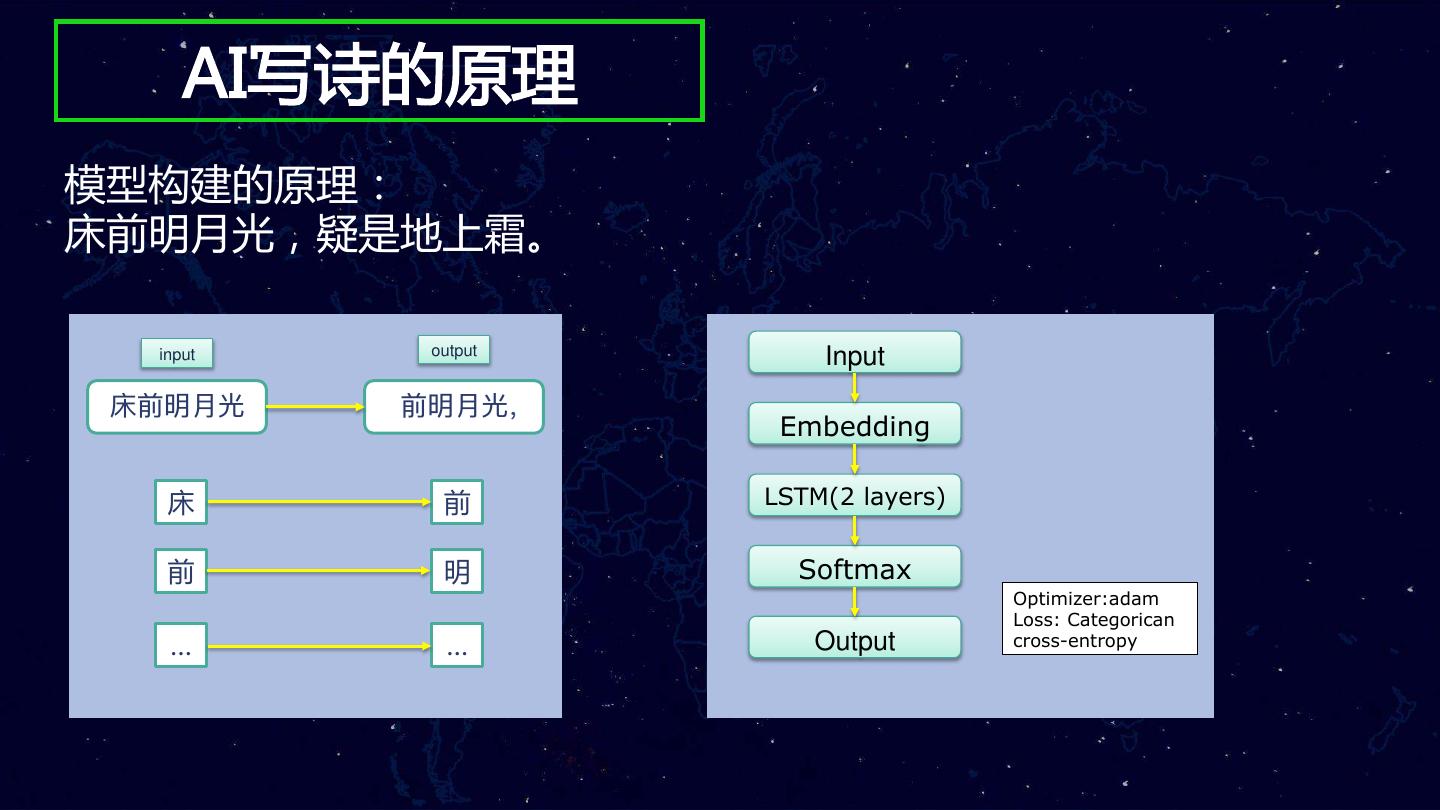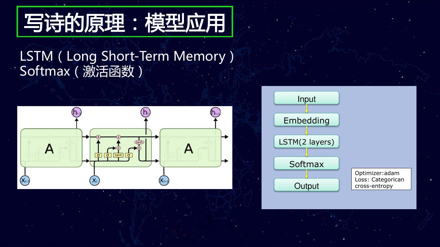 23 .写诗的原理:模型应用 LSTM(Long Short-Term Memory) Softmax(激活函数) Input Embedding LSTM(2 layers) Softmax Optimizer:adam Loss: Categorican Output cross-entropy