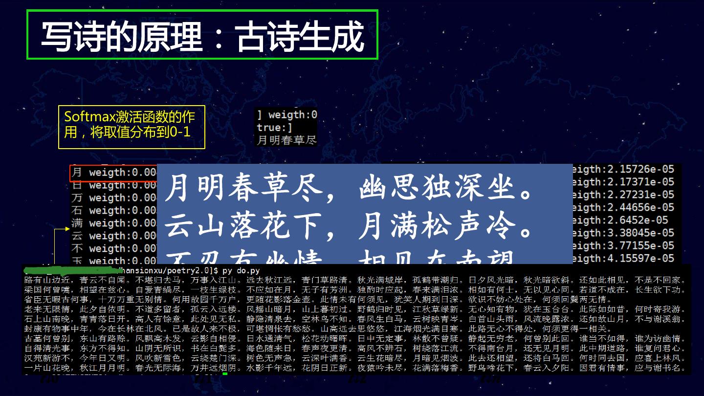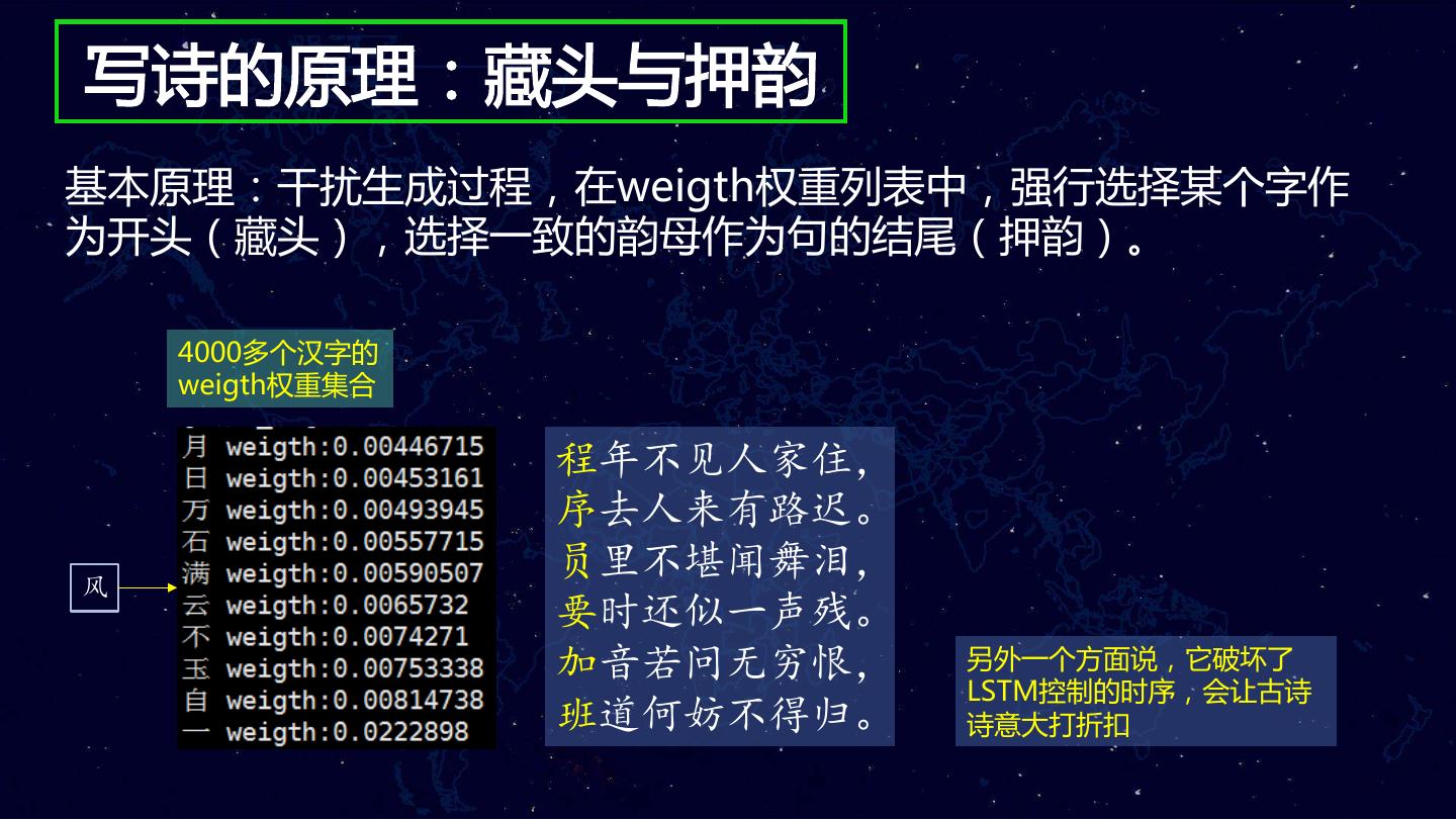 25 .写诗的原理:藏头与押韵 基本原理:干扰生成过程,在weigth权重列表中,强行选择某个字作 为开头(藏头),选择一致的韵母作为句的结尾(押韵)。 4000多个汉字的 weigth权重集合 程年不见人家住, 序去人来有路迟。 风 员里不堪闻舞泪, 要时还似一声残。 加音若问无穷恨, 另外一个方面说,它破坏了 LSTM控制的时序,会让古诗 班道何妨不得归。 诗意大打折扣