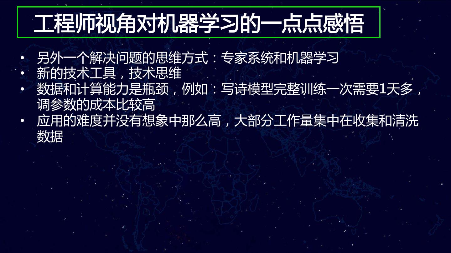 27 . 工程师视角对机器学习的一点点感悟 • 另外一个解决问题的思维方式:专家系统和机器学习 • 新的技术工具,技术思维 • 数据和计算能力是瓶颈,例如:写诗模型完整训练一次需要1天多, 调参数的成本比较高 • 应用的难度并没有想象中那么高,大部分工作量集中在收集和清洗 数据