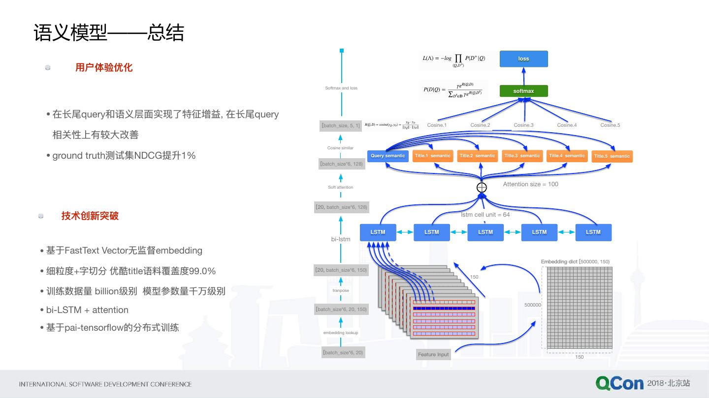 13 .语k模型——总结 loss አಁ֛ḵս۸ Softmax and loss softmax • ࣁᳩੲqueryԎ੶ᶎਫሿԧᇙीፅ, ࣁᳩੲquery >batch_size, 5, 1] Cosine.1 Cosine.2 Cosine.3 Cosine.4 Cosine.5 ፘىӤํय़ද࠺ Cosine similar • ground truthၥᦶᵞNDCG܋1% >batch_size*6, 128) Query semantic Title.1 semantic Title.2 semantic Title.3 semantic Title.4 semantic Title.5 semantic Soft attention Attention size = 100 >batch_size*6, 128) ದڠෛᑱᏈ lstm cell unit = 64 LSTM LSTM LSTM LSTM LSTM bi-lstm • चԭFastText Vector෫ፊembedding (PEHGGLQJGLFW>500000, 150) • ᕡᔉଶ+ਁ ړڔսᯡtitleාᥟፍଶ99.0% >batch_size*6, 150) 150 • ᦒᕞහഝᰁ billionᕆ ڦཛྷࣳ݇හᰁ܉ӡᕆ ڦ tranpose • bi-LSTM + attention 500000 >batch_size*6, 20, 150) • चԭpai-tensorflowጱړୗᦒᕞ embedding lookup >batch_size*6, 20) )HDWXUH,QSXW 150