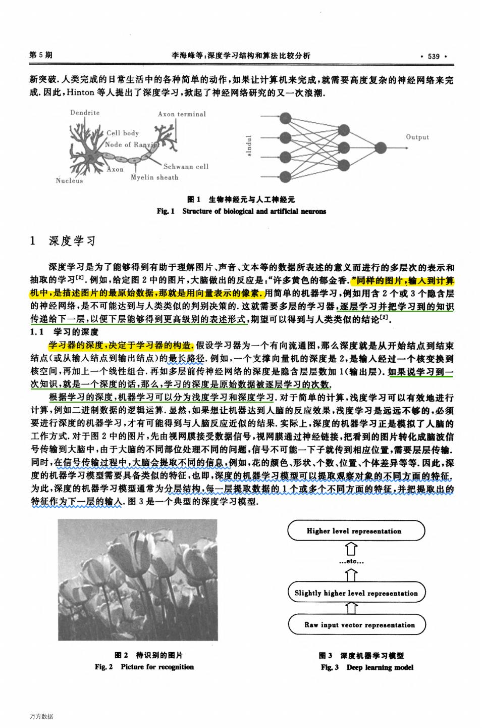 2 .第5期 李海峰等:深度学习结构和算法比较分析 新突破.人类完成的日常生活中的各种简单的动作,如果让计算机来完成,就需要高度复杂的神经网络来完 成.因此,Hinton等人提出了深度学习,掀起了神经网络研究的又一次浪潮. NUc 圈1生物神经元与人工神经元 №1 Structure of M¨ogI叫and"珊垴m琳—舢 1 深度学习 深度学习是为了能够得到有助于理解图片、声音、文本等的数据所表述的意义而进行的多层次的表示和 抽取的学习[2].例如,给定图2中的图片,大脑做出的反应是:“许多黄色的郁金香.”同样的图片.输入到计算 机中,是描述图片的最原始数据,那就是用向量表示的像素.用简单的机器学习,例如用含2个或3个隐含层 的神经网络,是不可能达到与人类类似的判别决策的.这就需要多层的学习器,逐层学习并把学习到的知识 传递给下一层,以便下层能够得到更高级别的表述形式,期望可以得到与人类类似的结论[2]. 1.1学习的深度 学习器的深度,决定于学习器的构造.假设学习器为一个有向流通图,那么深度就是从开始结点到结束 结点(或从输入结点到输出结点)的最长路径.例如,一个支撑向量机的深度是2,是输人经过一个核变换到 核空间,再加上一个线性组合.再如多层前传神经网络的深度是隐含层层数加1(输出层).如果说学习到一 次知识,就是一个深度的话,那么,学习的深度是原始数据被逐层学习的次数. 根据学习的深度,机器学习可以分为浅度学习和深度学习.对于简单的计算,浅度学习可以有效地进行 计算,例如二进制数据的逻辑运算.显然,如果想让机器达到人脑的反应效果,浅度学习是远远不够的,必须 要进行深度的机器学习,才有可能得到与人脑反应近似的结果.实际上,深度的机器学习正是模拟了人脑的 工作方式.对于图2中的图片,先由视网膜接受数据信号,视网膜通过神经链接,把看到的图片转化成脑波信 号传输到大脑中,由于大脑的不同部位处理不同的问题,信号不可能一下子就传到相应位置,需要层层传输. 同时,在信号传输过程中,大脑会提取不同的信息,饲如,花的颜色、形状、个数、位置、个体差异等等.因此,深 度的机器学习模型需要具备类似的特征,也即,深度的机器学习模型可以提取观察对象的不同方面的特征. 为此,深度的机器学习模型通常为分层结构,每一层提取数据的1个或多个不同方面的特征,并把提取出的 特征作为下一层的输入.图3是一个典型的深度学习模型. 口 …etc… 啊2待识嗣的圈片 圈3深度机■学习羹墨 Fig.2 Picture for recognition Fig.3 Deep k柚咖g model 万方数据