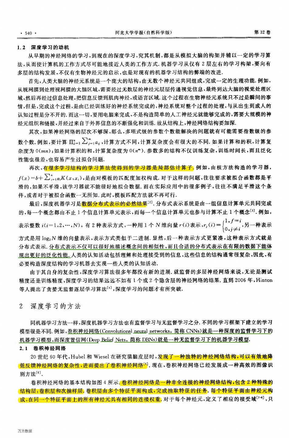 3 . 河北大学学报(自然科学版) 第32卷 1.2深度学习的动机 从早期的神经网络的学习,到现在的深度学习,究其机制,都是从模拟大脑的构架并辅以一定的学习算 法,从而使计算机的工作方式尽可能地接近人类的工作方式.机器学习从仅有2层左右的学习构架,要向有 多层的结构发展,不仅有生物神经元的启示,也是对现有的机器学习结构的弊端的改进. 首先,人类大脑的神经元系统是一个庞大的结构,由无数个神经元共同组成,完成一定的生理功能.例如, 从视网膜到处理视网膜的大脑区域,需要经过无数层的神经元层层传递视觉信息,最终到达大脑的视觉处理区 域,然后再经过信息处理,把信息反馈到肌肉神经,或语言区域.这个过程在生物神经元系统只不过是瞬间的事 情,但是,完成这个过程,是由已经训练好的神经系统完成的,神经系统对整个过程的处理,与从出生到成人的 认知过程是分不开的.而这一切,要用电脑来完成,不是构造简单的人工神经元就能够完成的,需要大规模的神 经元组织和链接,并经过来自于外界信息的不断强化和训练.故从结构上,神经网络结构要加深. 其次,如果神经网络的层次不够深,那么,多项式级的参数个数能解决的问题就有可能需要指数级的参 数个数.例如,要计算Ⅱ:一,己:‘-。口¨计算方式不同,计算复杂度会有很大的不同.如果计算和的积,计算复 杂度为0(ran);如果计算积的和,计算复杂度为0(卵”).参数多的结构不仅训练复杂,训练时间长,而且泛化 性能也很差,也容易产生过拟合问题. 再次,有很多学习结构的学习算法使得到的学习器是局部估计算子.例如,由核方法构造的学习器, 厂(z)一6+2/?;.口iK(z,z。),是由对模板的匹配度加权构成.对于这样的问题,往往要求被拟合函数都是平 滑的,如果不平滑,该学习器就不能很好地拟合数据.而在实际应用中的很多例子,往往不满足平滑这个条 件,或者对于被拟合函数一无所知.此时,模板匹配方法就不再可行. 最后,深度机器学习是数据分布式表示的必然结果口].分布式表示系统是由一组信息计算单元共同完成 的,每一个概念都由不止1个信息计算单元表示,而每一个信息计算单元也参与计算不止1个概念口].例如, ,1.f—i 表示整数i(i一1,2,…,N),有2种表示方式,~种用1个N维向量r(i)表示,r,(i)一J一。i,.,另一种表示 !o,J≠i 方式是用log。N维的向量表示,表示方式类似于二进制.显然,后一种表示方式更紧凑,这种表示方式就是 分布式表示.分布式表示不仅可以很好地描述概念间的相似性,而且合适的分布式表示在有限的数据下能体 现出更好的泛化性能.人类的认知活动包括理解昶处理接受到的信息,这些信息的结构通常很复杂,因此,有 必要构造深度结构的学习机器去实现一些人类的认知活动. 由于其自身的复杂性,深度学习算法很多年都没有新的进展.就监督的多层神经网络来说,无论是测试 精度还是训练精度,深度学习的结果远远不如有1个或2个隐含层的神经网络的结果.直到2006年,Hinton 等人提出了贪婪无监督逐层学习算法H],深度学习的问题才有所突破. 2 深度学习的方法 同机器学习方法一样,深度机器学习方法也有监督学习与无监督学习之分.不同的学习框架下建立的学习 模型很是不同.例如,卷积神经网络(Convolutional neural networks,简称CNNs)就是一种深度的监督学习下的 机器学习模型,而深度置信网(Deep Belief Nets,简称DBNs)就是一种无监督学习下的机器学习模型. 2.1卷积神经网络 20世纪60年代,Hubel和Wiesel在研究猫脑皮层时,发现了一种独特的神经网络结构,可以有效地降 低反馈神经网络的复杂性,进而提出了卷积神经网络口].现在,卷积神经网络已经发展成一种高效的图像识 别方法‘6|. 卷积神经网络的基本结构如图4所示.卷积神经网络是一种非全连接的神经网络结构,包含2种特殊的 结构层:卷积层和次抽样层.卷积层由多个特征平面构成,完成抽取特征的任务.每个特征平面由神经元构 成,在同一个特征平面上的所有神经元具有相同的连接权重.对于每个神经元,定义了相应的接受域口剖,只 万方数据