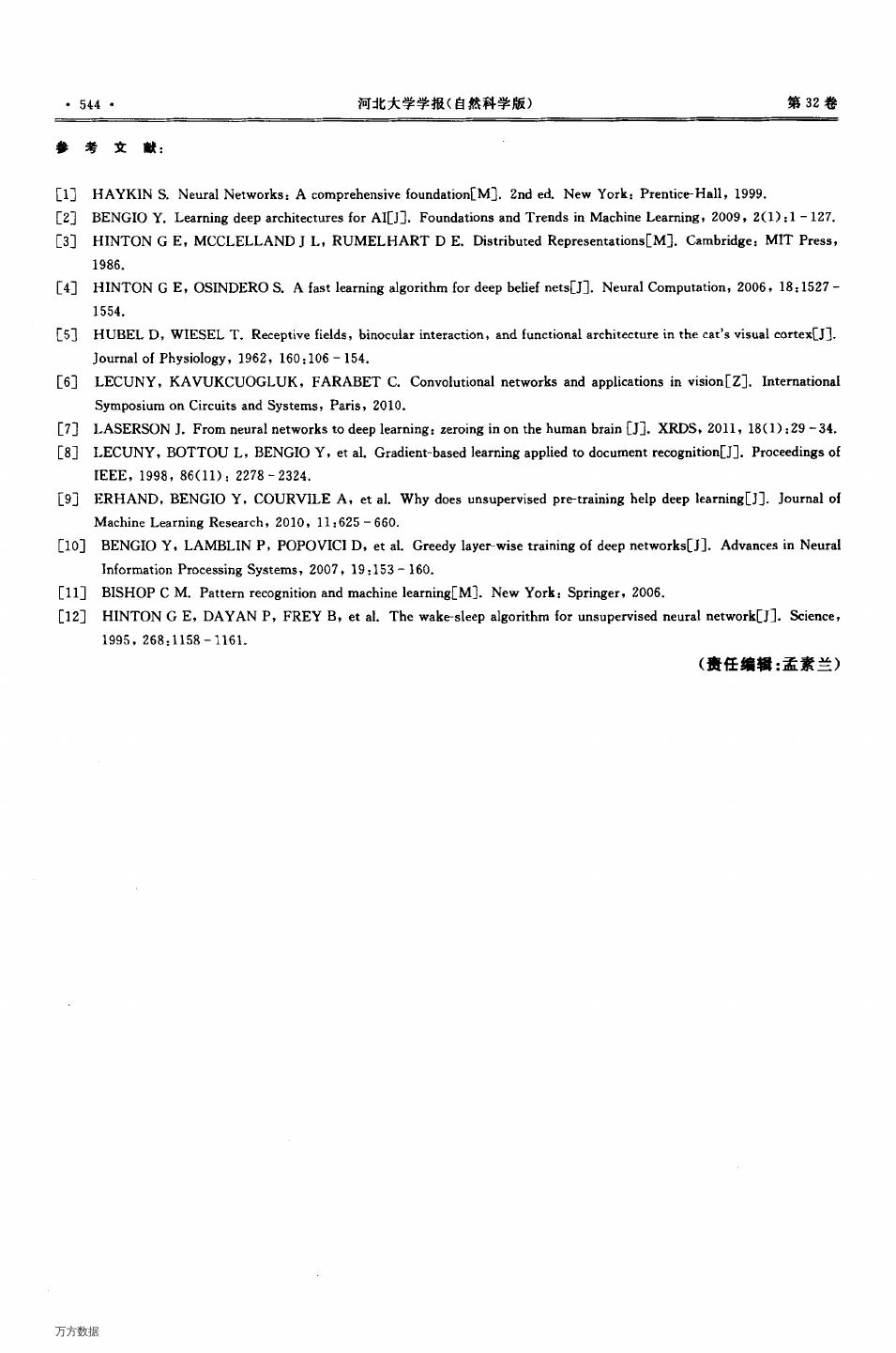 7 . .544. 河北大学学报(自然科学版) 第32卷 参考文献: [13 HAYKIN S.Neural Networks:A comprehensive foundation[M].2nd ed.New York:Prentice-Hall,1999. [2] BENGIO Y.Learning deep architectures for AID].Foundations and Trends in Machine Learning,2009,2(1):1—127. [3] HINTON G E,MCCLELLAND J L,RUMELHART D E,Distributed Representations[M].Cambridge:MIT Press, 1986. [4] HINTON G E.OSINDERO S.A fast learning algorithm for deep belief nets[J].Neural Computation,2006,18:1527一 1554. [5] HUBEL D,WIESEL T.Reeeptive fields,hinoeular interaction。and functional architecture in the eat’s visual eortex[J]. Journal of Physiology,1962,160:106—154. [6] LECUNY,KAVUKCUOGLUK,FARABET C.Convolutional networks and applications in vision[Z].International Symposium on Circuits and Systems,Paris,2010。 [7] LASERSON J.From neural networks tO deep learning:zeroing in on the human brain[J].XRDS,2011,18(1):29—34. [8] LECUNY。BOTTOU L,BENGIO Y,et a1.Gradient—based learning applied tO document recognition[J].Proceedings of lEEE,1998,86(11):2278—2324. [9] ERHAND。BENGIO Y,COURVILE A,et a1.Why does unsupervised pre-training help deep learning[J].Journal of Machine Learning Reseatch,2010,11:625—660. [103 BENGIO Y,LAMBLIN P,POPOVICI D,et a1.Greedy layer-wise training of deep networks[J].Advances in Neural lnformation Processing Systems,2007,19:153—160. [11] BISHOP C M.Pattern recognition and machine learning[M].New York:Springer,2006. [12] HINTON G E,DAYAN P,FREY B,et a1.The wake-sleep algorithm for unsupervised neural network[J].Science, 1995,268:1158—1161. (责任编辑:孟素兰) 万方数据