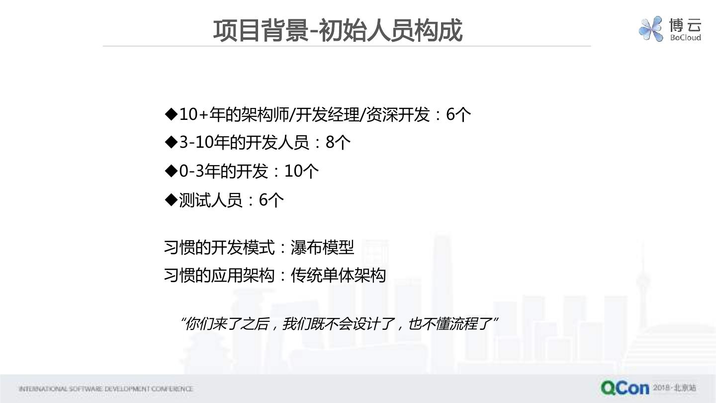 6 . 项目背景-初始人员构成 u 10+年的架构师/开发经理/资深开发:6个 u 3-10年的开发人员:8个 u 0-3年的开发:10个 u 测试人员:6个 习惯的开发模式:瀑布模型 习惯的应用架构:传统单体架构 “你们来了之后,我们既不会设计了,也不懂流程了”