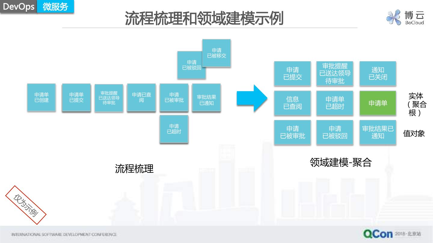 24 .DevOps 微服务 流程梳理和领域建模示例 申请 已被移交 申请 已被驳回 审批提醒 申请 通知 已送达领导 已提交 已关闭 待审批 申请已提 审批提醒 申请单 已创建 申请单 交 已提交 已送达领导 申请已查 信息已查 阅 申请 申请已被 已被审批 通知已关 审批结果 信息 申请单 实体 审批 闭 (流程节点) 待审批 已通知 申请单 (聚合 已查阅 已超时 根) 申请 申请已超 已超时 申请 申请 审批结果已 时 已被审批 已被驳回 通知 值对象 领域建模-聚合 流程梳理