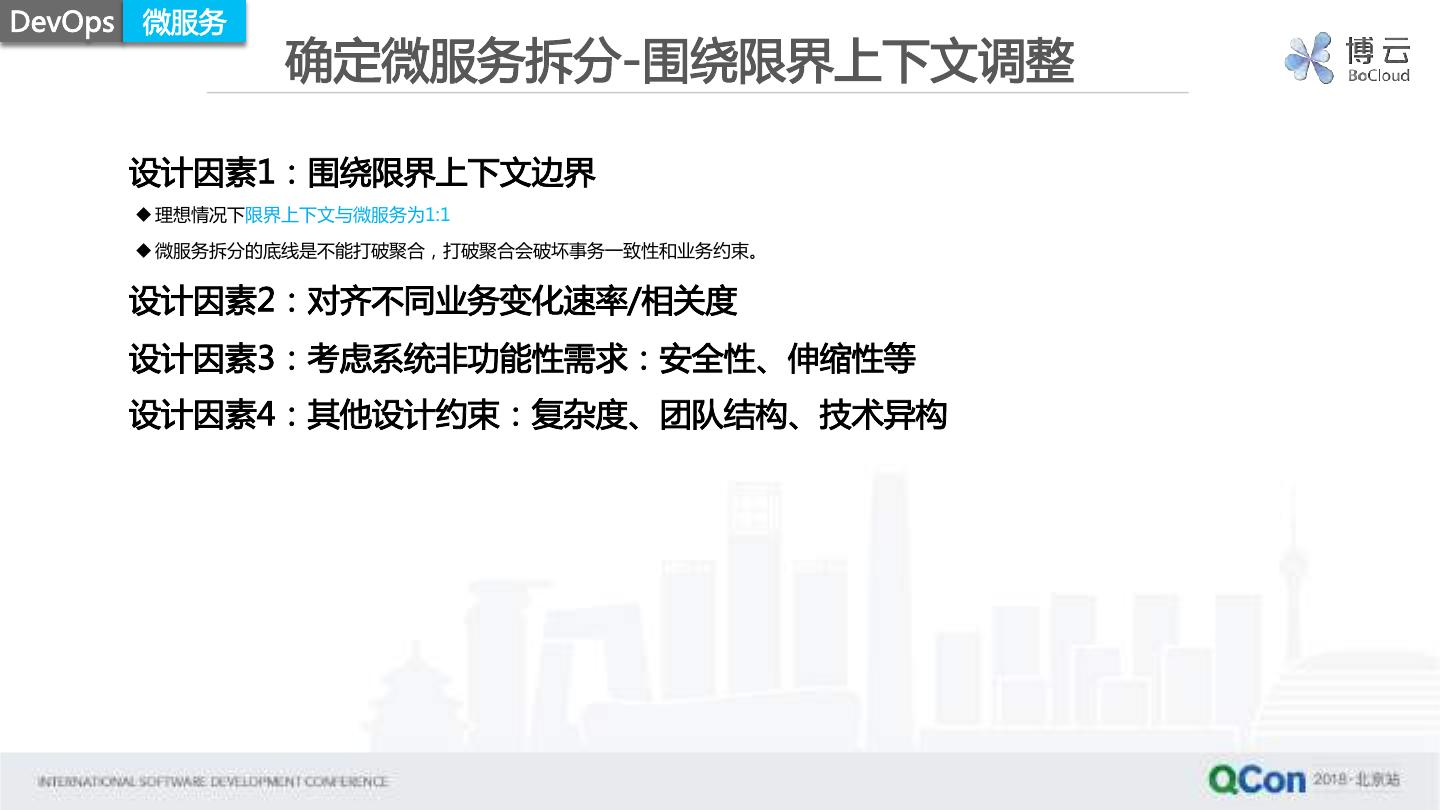 26 .DevOps 微服务 确定微服务拆分-围绕限界上下文调整 设计因素1:围绕限界上下文边界 u 理想情况下限界上下文与微服务为1:1 u 微服务拆分的底线是不能打破聚合,打破聚合会破坏事务一致性和业务约束。 设计因素2:对齐不同业务变化速率/相关度 设计因素3:考虑系统非功能性需求:安全性、伸缩性等 设计因素4:其他设计约束:复杂度、团队结构、技术异构