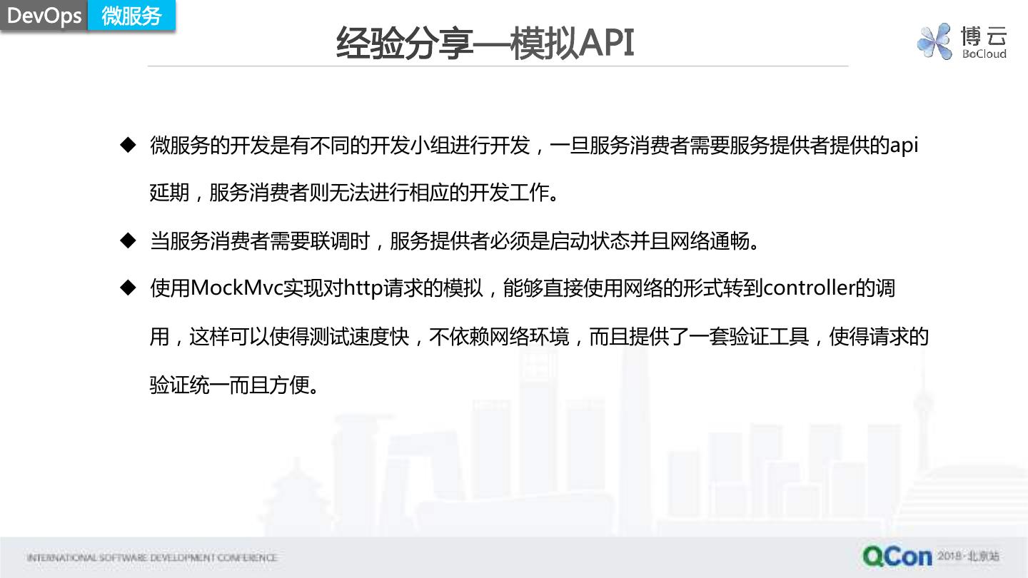 29 .DevOps 微服务 经验分享—模拟API u 微服务的开发是有不同的开发小组进行开发,一旦服务消费者需要服务提供者提供的api 延期,服务消费者则无法进行相应的开发工作。 u 当服务消费者需要联调时,服务提供者必须是启动状态并且网络通畅。 u 使用MockMvc实现对http请求的模拟,能够直接使用网络的形式转到controller的调 用,这样可以使得测试速度快,不依赖网络环境,而且提供了一套验证工具,使得请求的 验证统一而且方便。