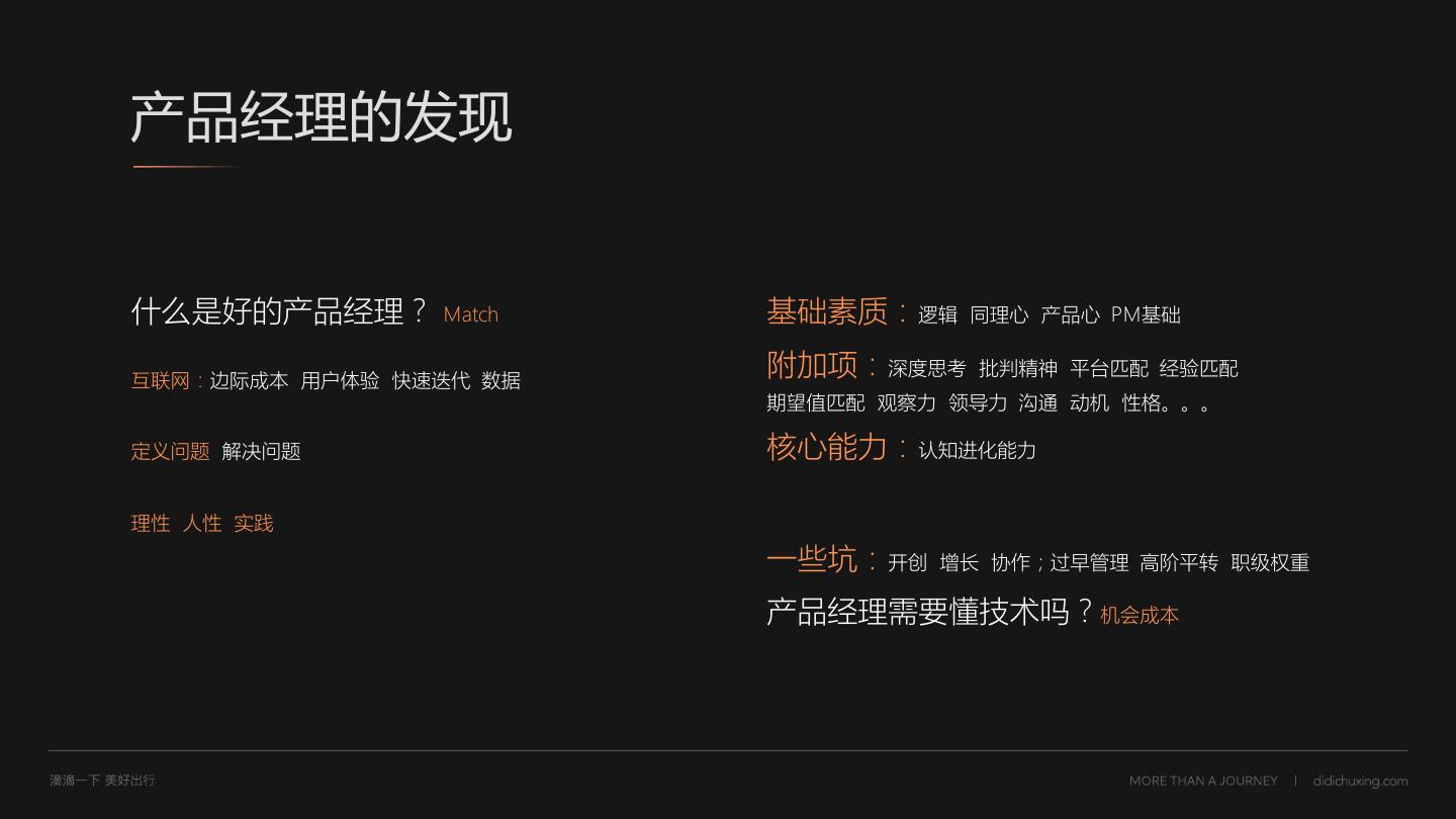 3 .产品经理的发现 什么是好的产品经理? Match 基础素质:逻辑 同理心 产品心 PM基础 互联网:边际成本 用户体验 快速迭代 数据 附加项:深度思考 批判精神 平台匹配 经验匹配 期望值匹配 观察力 领导力 沟通 动机 性格。。。 定义问题 解决问题 核心能力:认知进化能力 理性 人性 实践 一些坑:开创 增长 协作;过早管理 高阶平转 职级权重 产品经理需要懂技术吗?机会成本