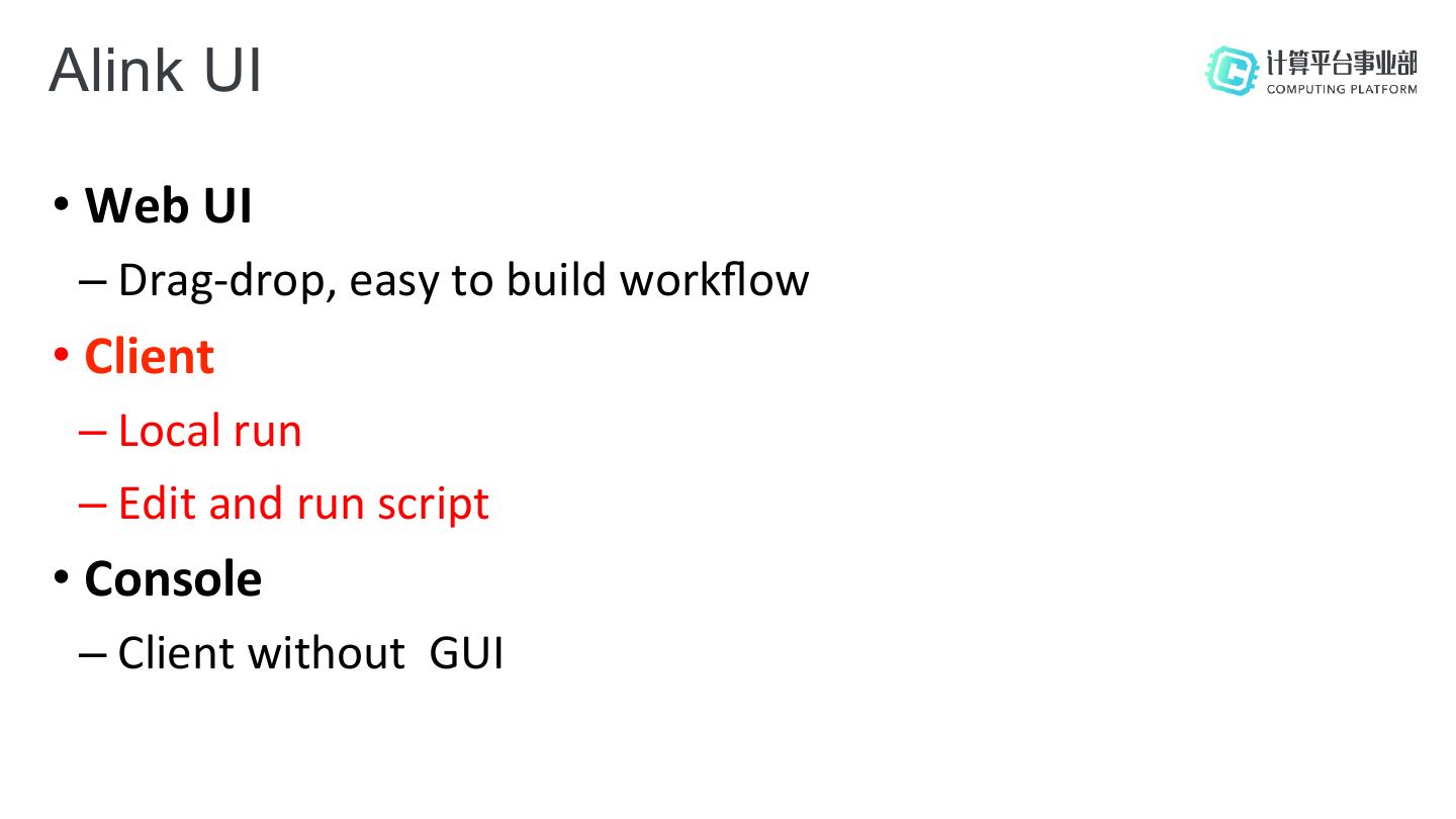 17 .Alink UI • Web UI – Drag-drop, easy to build workflow • Client – Local run – Edit and run script • Console – Client without GUI