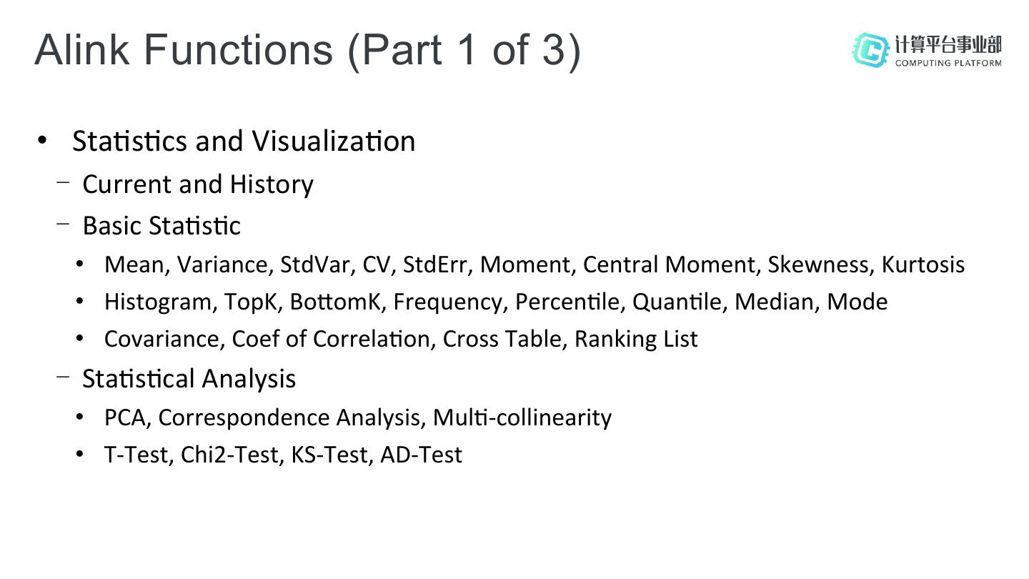 21 .Alink Functions (Part 1 of 3) • Sta;s;cs and Visualiza;on - Current and History - Basic Sta;s;c • Mean, Variance, StdVar, CV, StdErr, Moment, Central Moment, Skewness, Kurtosis • Histogram, TopK, Bo[omK, Frequency, Percen;le, Quan;le, Median, Mode • Covariance, Coef of Correla;on, Cross Table, Ranking List - Sta;s;cal Analysis • PCA, Correspondence Analysis, Mul;-collinearity • T-Test, Chi2-Test, KS-Test, AD-Test
