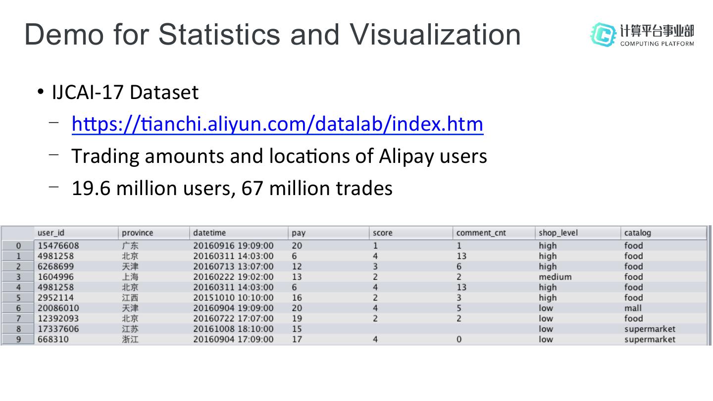 22 .Demo for Statistics and Visualization • IJCAI-17 Dataset - h[ps://;anchi.aliyun.com/datalab/index.htm - Trading amounts and loca;ons of Alipay users - 19.6 million users, 67 million trades
