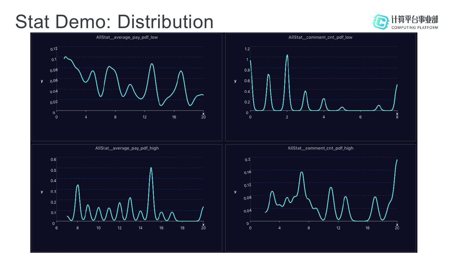 25 .Stat Demo: Distribution • Get 2 stream data: shop_level=‘low’, shop_level=‘high’ • Consider 2 Features : comment_cnt and pay • Probabilis;c Distribu;on