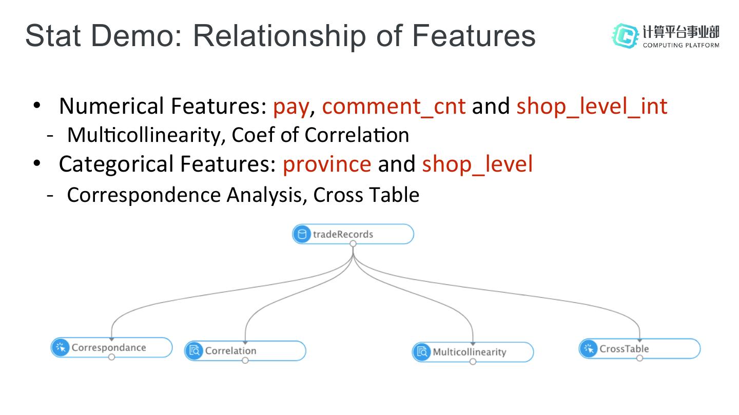 27 .Stat Demo: Relationship of Features • Numerical Features: pay, comment_cnt and shop_level_int - Mul;collinearity, Coef of Correla;on • Categorical Features: province and shop_level - Correspondence Analysis, Cross Table
