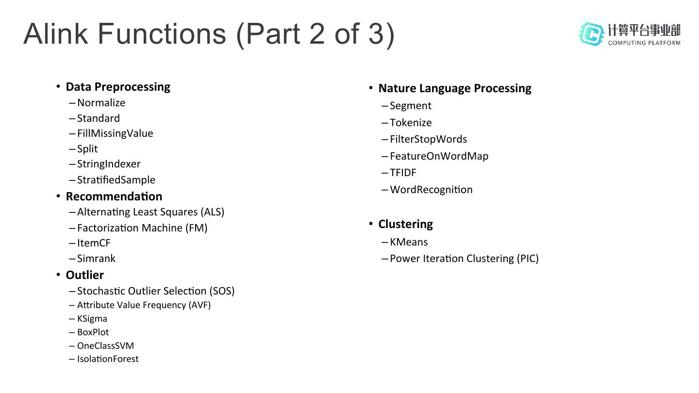 5 .Alibaba’s Common Algorithm Platform on Flink • Code Name: Alink - Common part of related words - Alibaba, Algorithm, AI, Flink, Blink • Current supported algorithms - Sta;s;cs, Machine Learning, Recommenda;on, Outlier