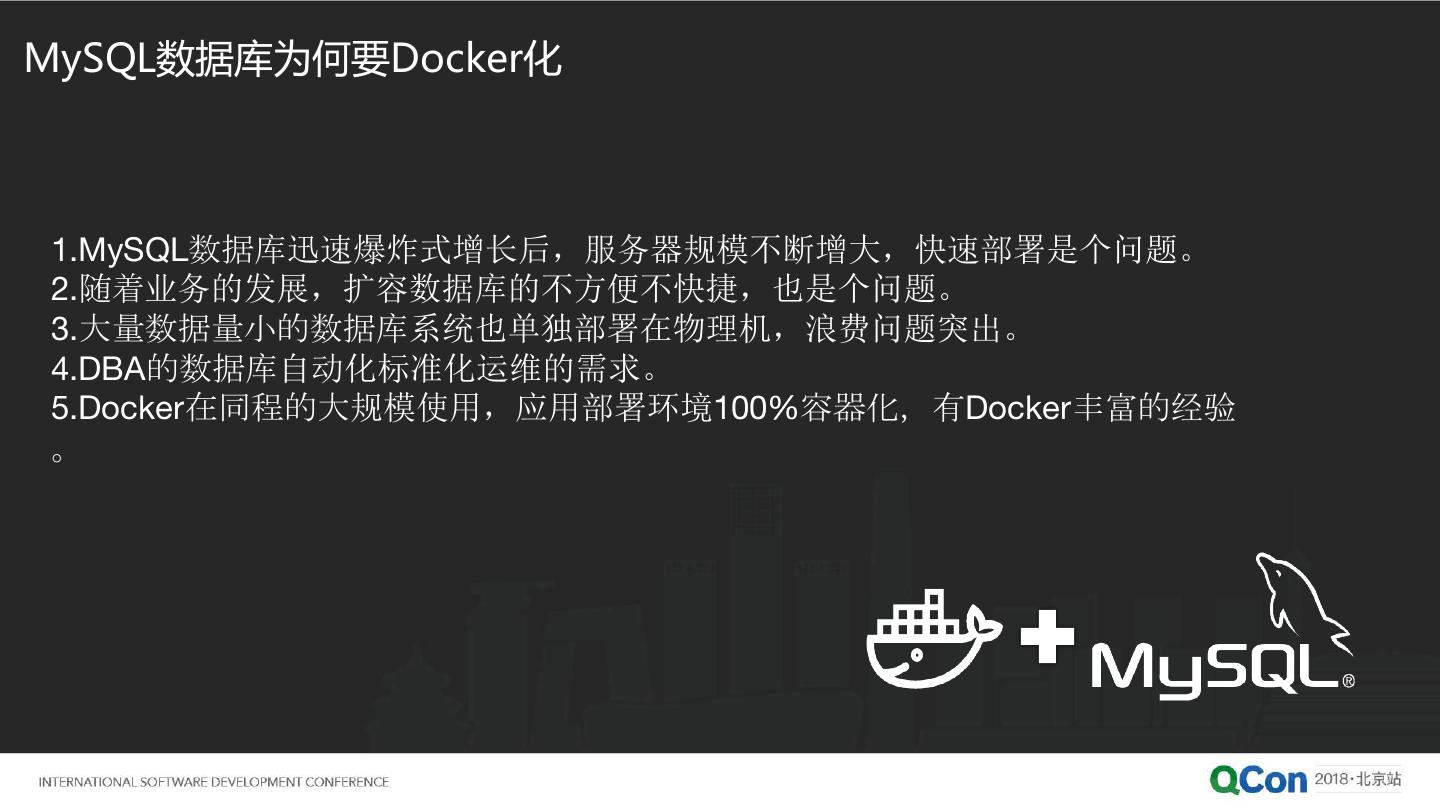 3 .MySQL数据库为何要Docker化 1.MySQL数据库迅速爆炸式增长后,服务器规模不断增大,快速部署是个问题。 2.随着业务的发展,扩容数据库的不方便不快捷,也是个问题。 3.大量数据量小的数据库系统也单独部署在物理机,浪费问题突出。 4.DBA的数据库自动化标准化运维的需求。 5.Docker在同程的大规模使用,应用部署环境100%容器化,有Docker丰富的经验 。