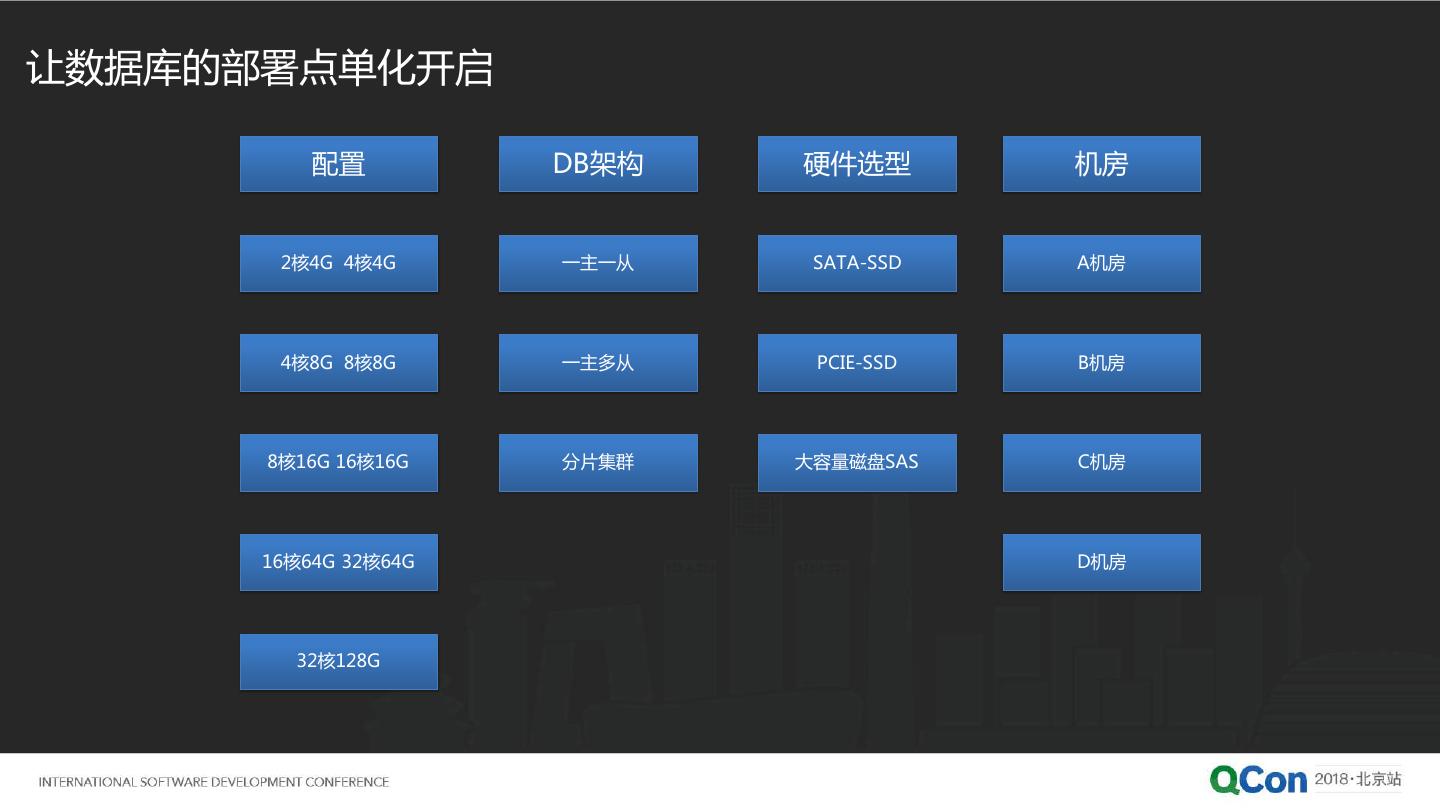 4 .让数据库的部署点单化开启 配置 DB架构 硬件选型 机房 2核4G 4核4G 一主一从 SATA-SSD A机房 4核8G 8核8G 一主多从 PCIE-SSD B机房 8核16G 16核16G 分片集群 大容量磁盘SAS C机房 16核64G 32核64G D机房 32核128G