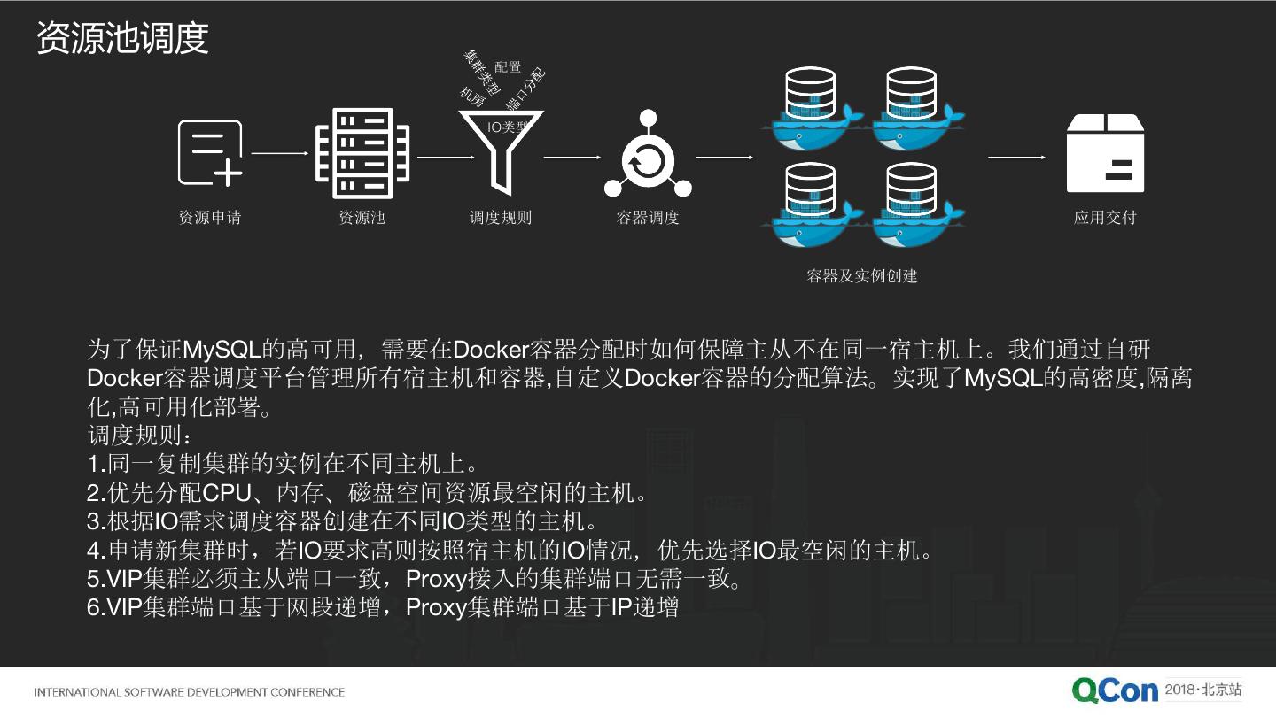 7 .资源池调度 配置 IO类型 资源申请 资源池 调度规则 容器调度 应用交付 容器及实例创建 为了保证MySQL的高可用,需要在Docker容器分配时如何保障主从不在同一宿主机上。我们通过自研 Docker容器调度平台管理所有宿主机和容器,自定义Docker容器的分配算法。实现了MySQL的高密度,隔离 化,高可用化部署。 调度规则: 1.同一复制集群的实例在不同主机上。 2.优先分配CPU、内存、磁盘空间资源最空闲的主机。 3.根据IO需求调度容器创建在不同IO类型的主机。 4.申请新集群时,若IO要求高则按照宿主机的IO情况,优先选择IO最空闲的主机。 5.VIP集群必须主从端口一致,Proxy接入的集群端口无需一致。 6.VIP集群端口基于网段递增,Proxy集群端口基于IP递增
