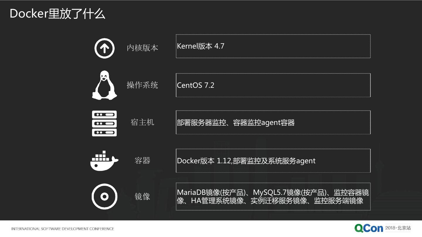 8 .Docker里放了什么 内核版本 Kernel版本 4.7 操作系统 CentOS 7.2 宿主机 部署服务器监控、容器监控agent容器 容器 Docker版本 1.12,部署监控及系统服务agent MariaDB镜像(按产品)、MySQL5.7镜像(按产品)、监控容器镜 镜像 像、HA管理系统镜像、实例迁移服务镜像、监控服务端镜像