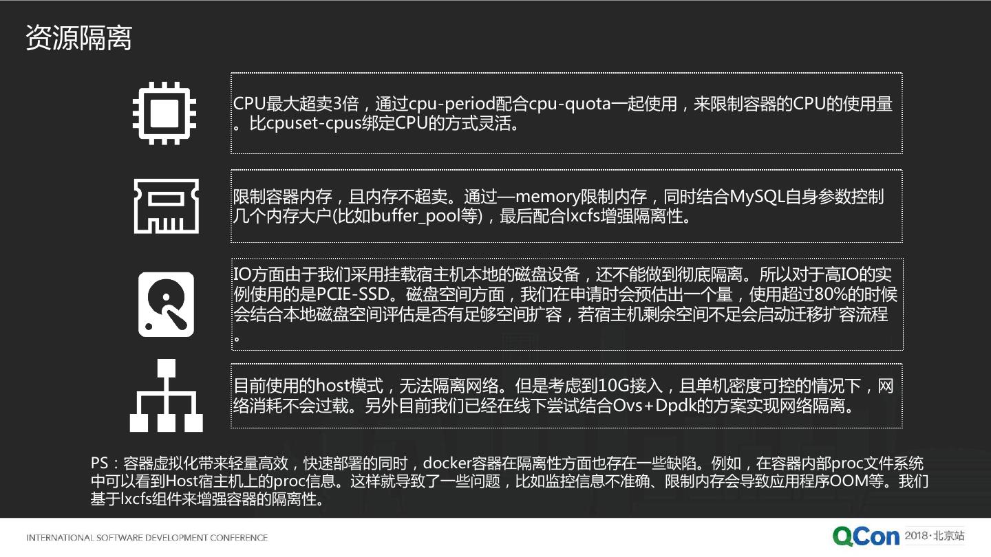 9 .资源隔离 CPU最大超卖3倍,通过cpu-period配合cpu-quota一起使用,来限制容器的CPU的使用量 。比cpuset-cpus绑定CPU的方式灵活。 限制容器内存,且内存不超卖。通过—memory限制内存,同时结合MySQL自身参数控制 几个内存大户(比如buffer_pool等),最后配合lxcfs增强隔离性。 IO方面由于我们采用挂载宿主机本地的磁盘设备,还不能做到彻底隔离。所以对于高IO的实 例使用的是PCIE-SSD。磁盘空间方面,我们在申请时会预估出一个量,使用超过80%的时候 会结合本地磁盘空间评估是否有足够空间扩容,若宿主机剩余空间不足会启动迁移扩容流程 。 目前使用的host模式,无法隔离网络。但是考虑到10G接入,且单机密度可控的情况下,网 络消耗不会过载。另外目前我们已经在线下尝试结合Ovs+Dpdk的方案实现网络隔离。 PS:容器虚拟化带来轻量高效,快速部署的同时,docker容器在隔离性方面也存在一些缺陷。例如,在容器内部proc文件系统 中可以看到Host宿主机上的proc信息。这样就导致了一些问题,比如监控信息不准确、限制内存会导致应用程序OOM等。我们 基于lxcfs组件来增强容器的隔离性。