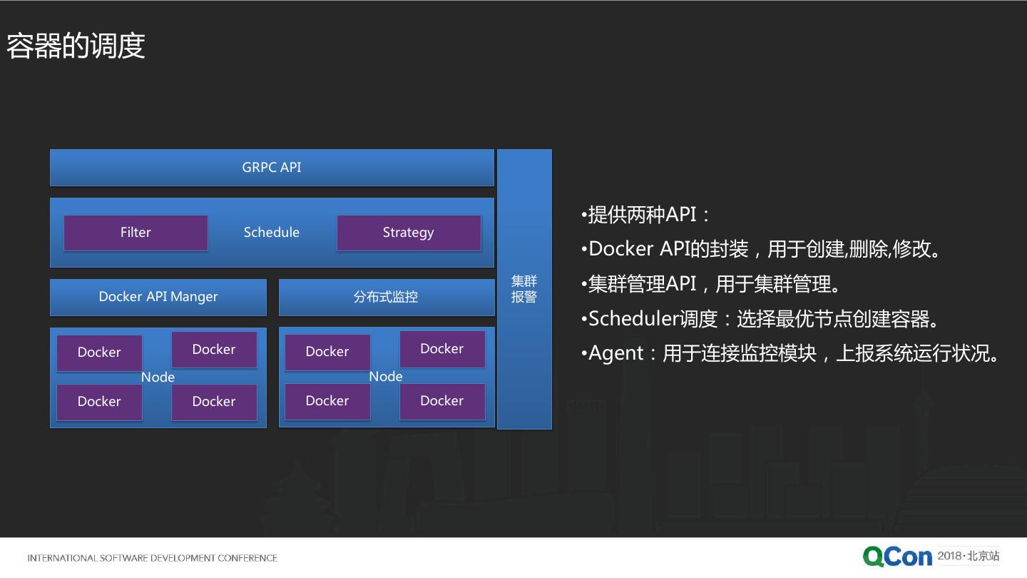 10 .容器的调度 GRPC API •提供两种API: Filter Schedule Strategy •Docker API的封装,用于创建,删除,修改。 集群 •集群管理API,用于集群管理。 Docker API Manger 分布式监控 报警 •Scheduler调度:选择最优节点创建容器。 Docker Docker Docker Docker •Agent:用于连接监控模块,上报系统运行状况。 Node Node Docker Docker Docker Docker