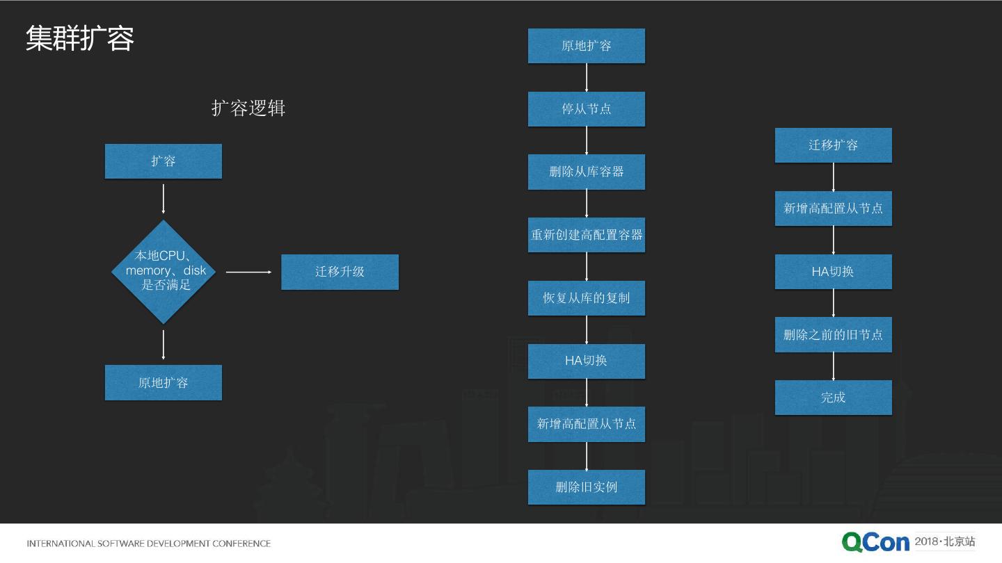 12 .集群扩容 原地扩容 扩容逻辑 停从节点 迁移扩容 扩容 删除从库容器 新增高配置从节点 重新创建高配置容器 本地CPU、 memory、disk 迁移升级 HA切换 是否满足 恢复从库的复制 删除之前的旧节点 HA切换 原地扩容 完成 新增高配置从节点 删除旧实例
