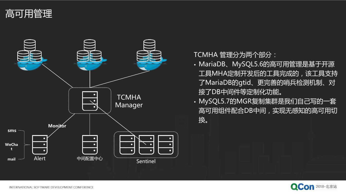 13 .高可用管理 TCMHA 管理分为两个部分: • MariaDB、MySQL5.6的高可用管理是基于开源 工具MHA定制开发后的工具完成的,该工具支持 了MariaDB的gtid、更完善的哨兵检测机制、对 接了DB中间件等定制化功能。 TCMHA • MySQL5.7的MGR复制集群是我们自己写的一套 Manager 高可用组件配合DB中间,实现无感知的高可用切 换。 Monitor sms WeCha t mail Alert 中间配置中心 Sentinel