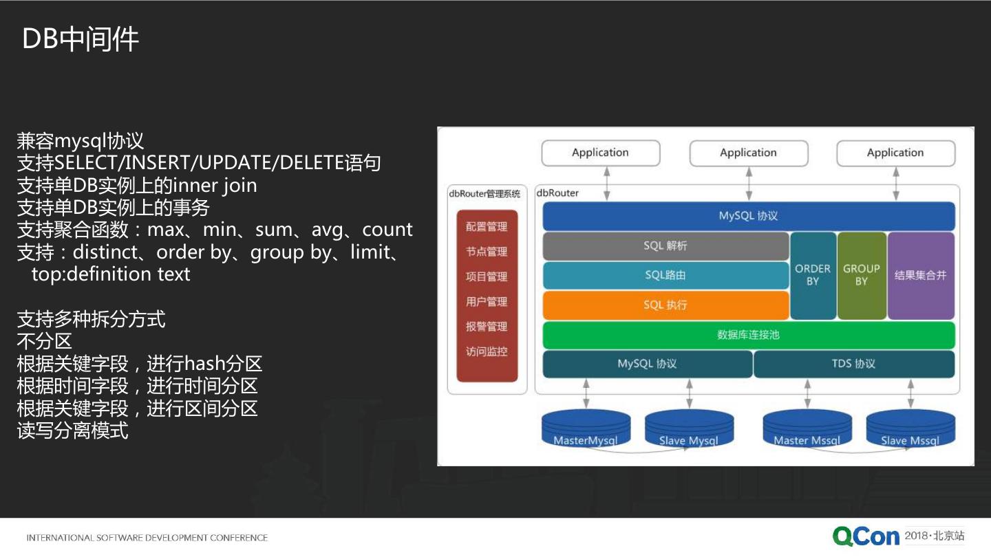 14 .DB中间件 兼容mysql协议 支持SELECT/INSERT/UPDATE/DELETE语句 支持单DB实例上的inner join 支持单DB实例上的事务 支持聚合函数:max、min、sum、avg、count 支持:distinct、order by、group by、limit、 top:definition text 支持多种拆分方式 不分区 根据关键字段,进行hash分区 根据时间字段,进行时间分区 根据关键字段,进行区间分区 读写分离模式