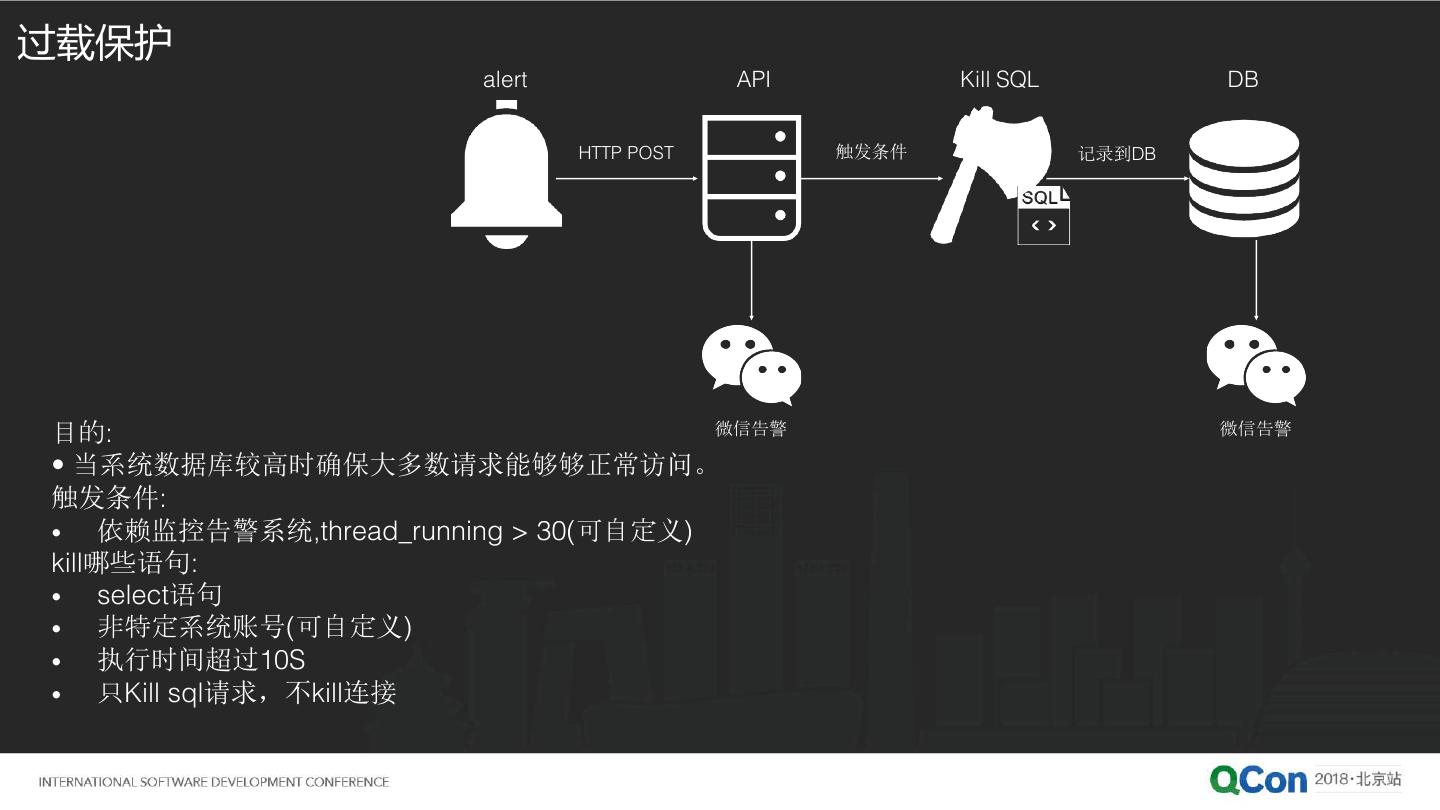 17 .过载保护 alert API Kill SQL DB HTTP POST 触发条件 记录到DB 目的: 微信告警 微信告警 • 当系统数据库较高时确保大多数请求能够够正常访问。 触发条件: • 依赖监控告警系统,thread_running > 30(可自定义) kill哪些语句: • select语句 • 非特定系统账号(可自定义) • 执行时间超过10S • 只Kill sql请求,不kill连接