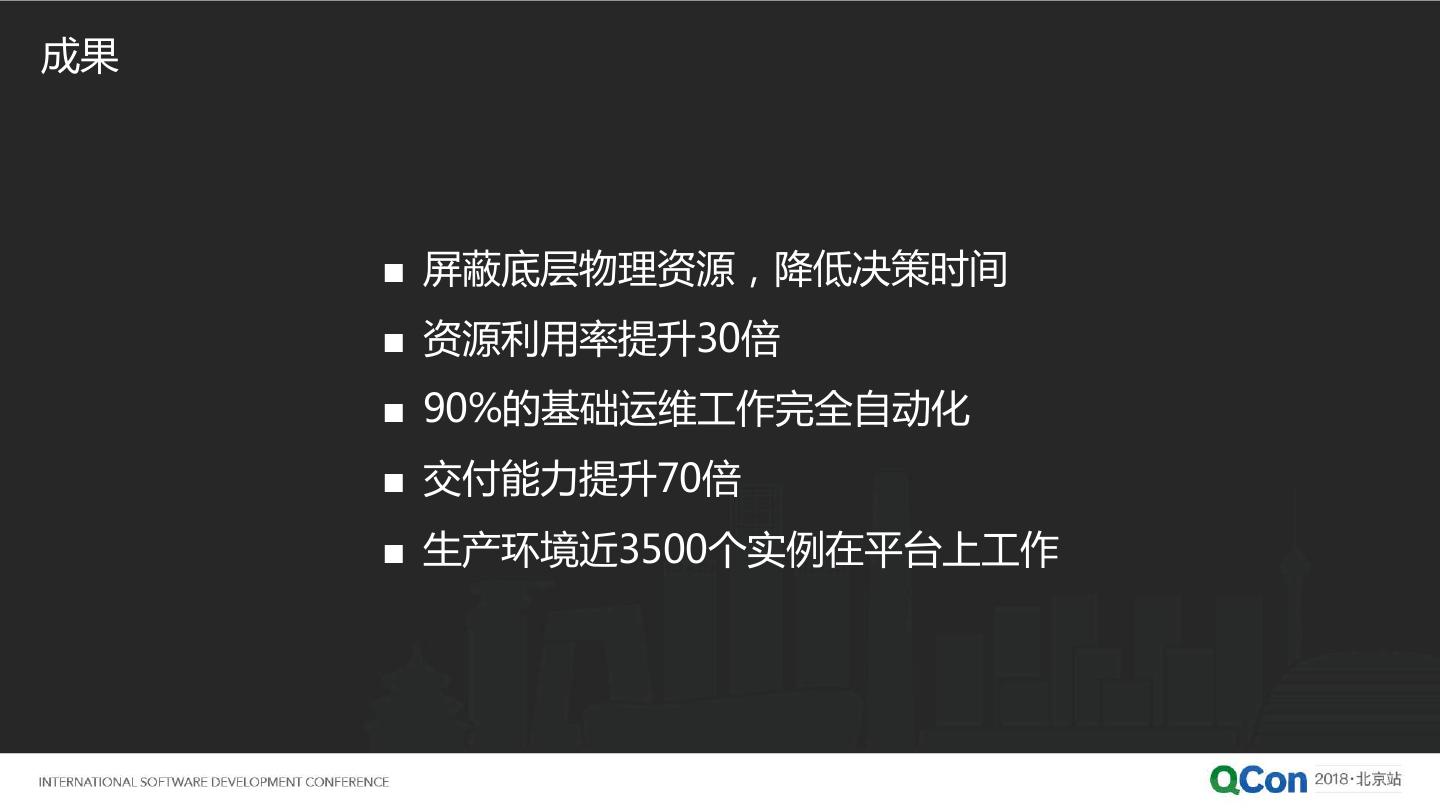23 .成果 ■ 屏蔽底层物理资源,降低决策时间 ■ 资源利用率提升30倍 ■ 90%的基础运维工作完全自动化 ■ 交付能力提升70倍 ■ 生产环境近3500个实例在平台上工作