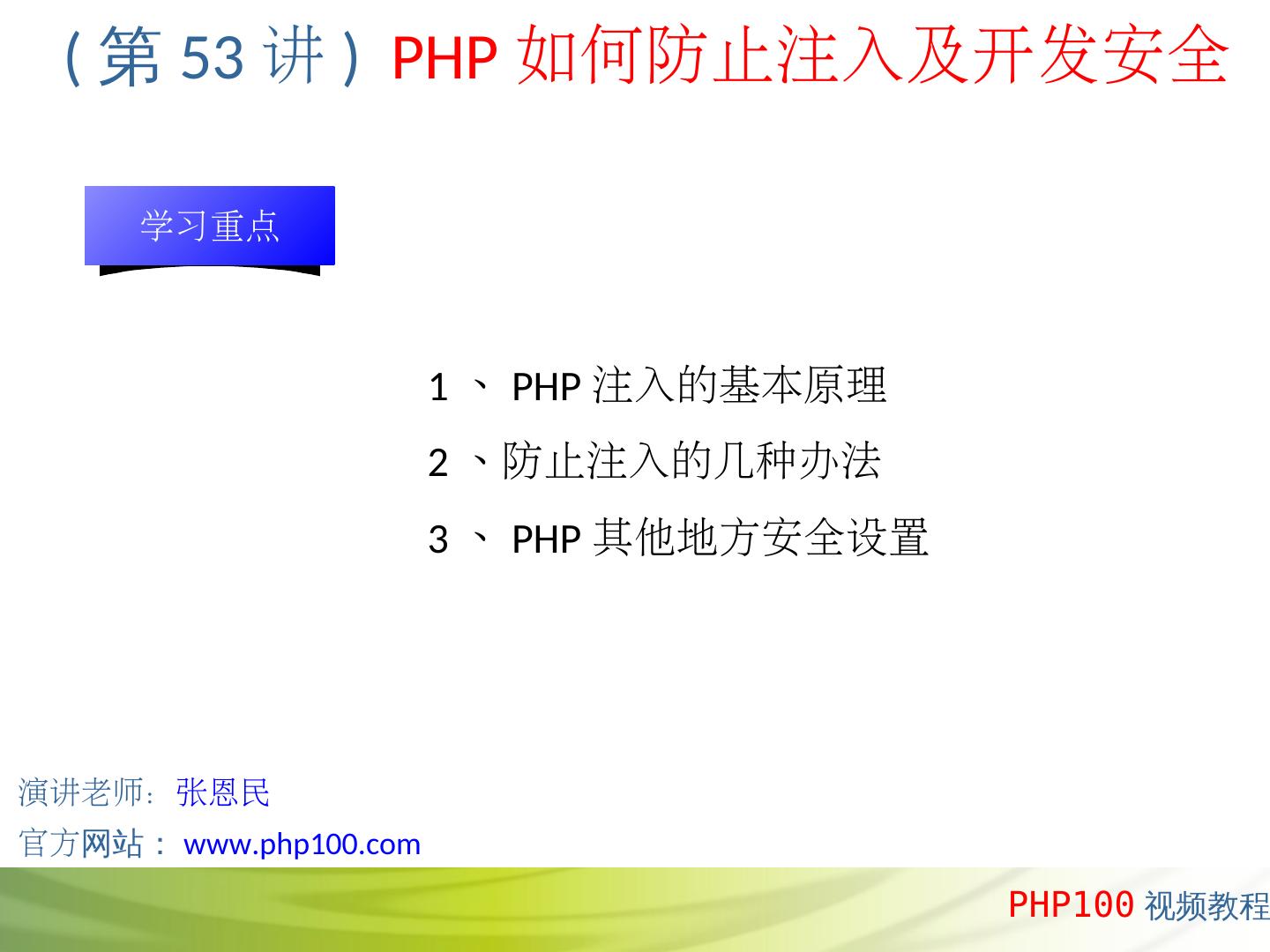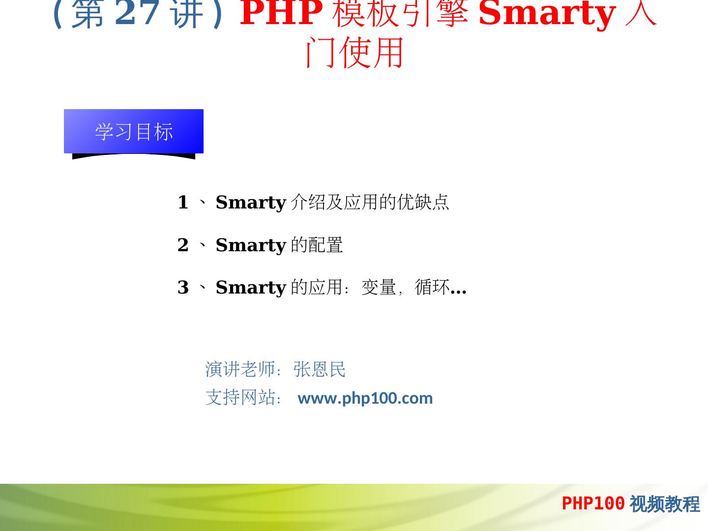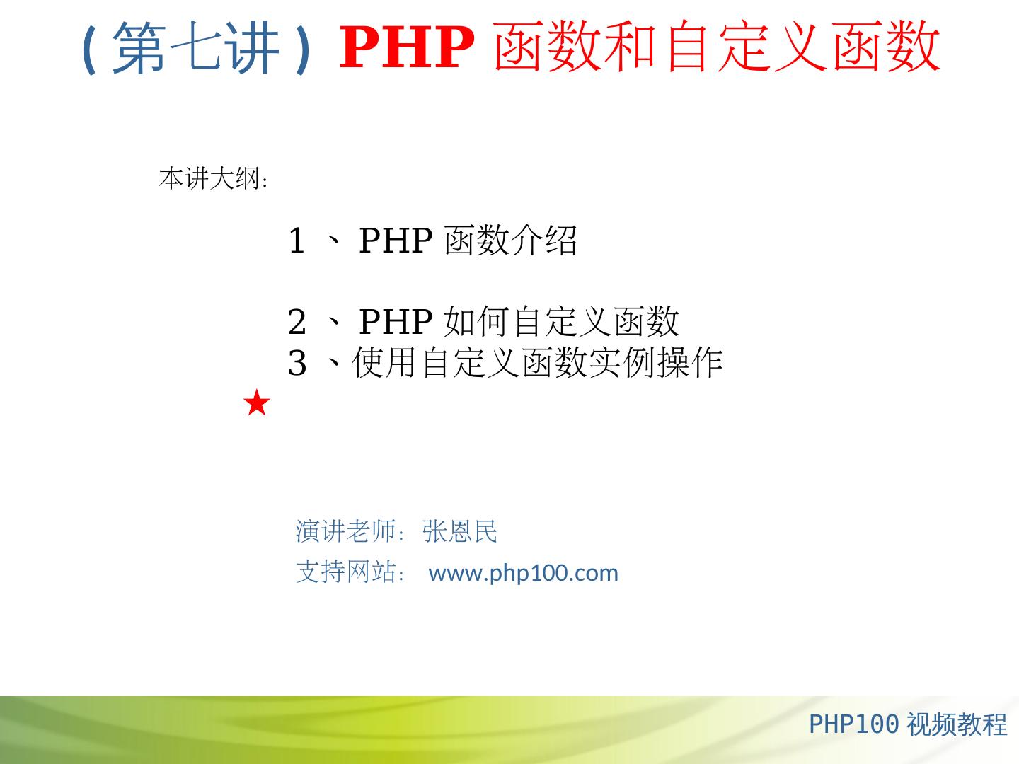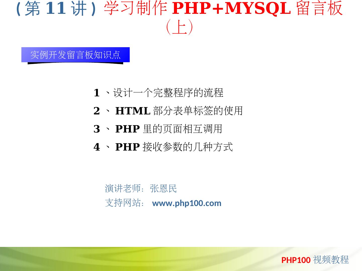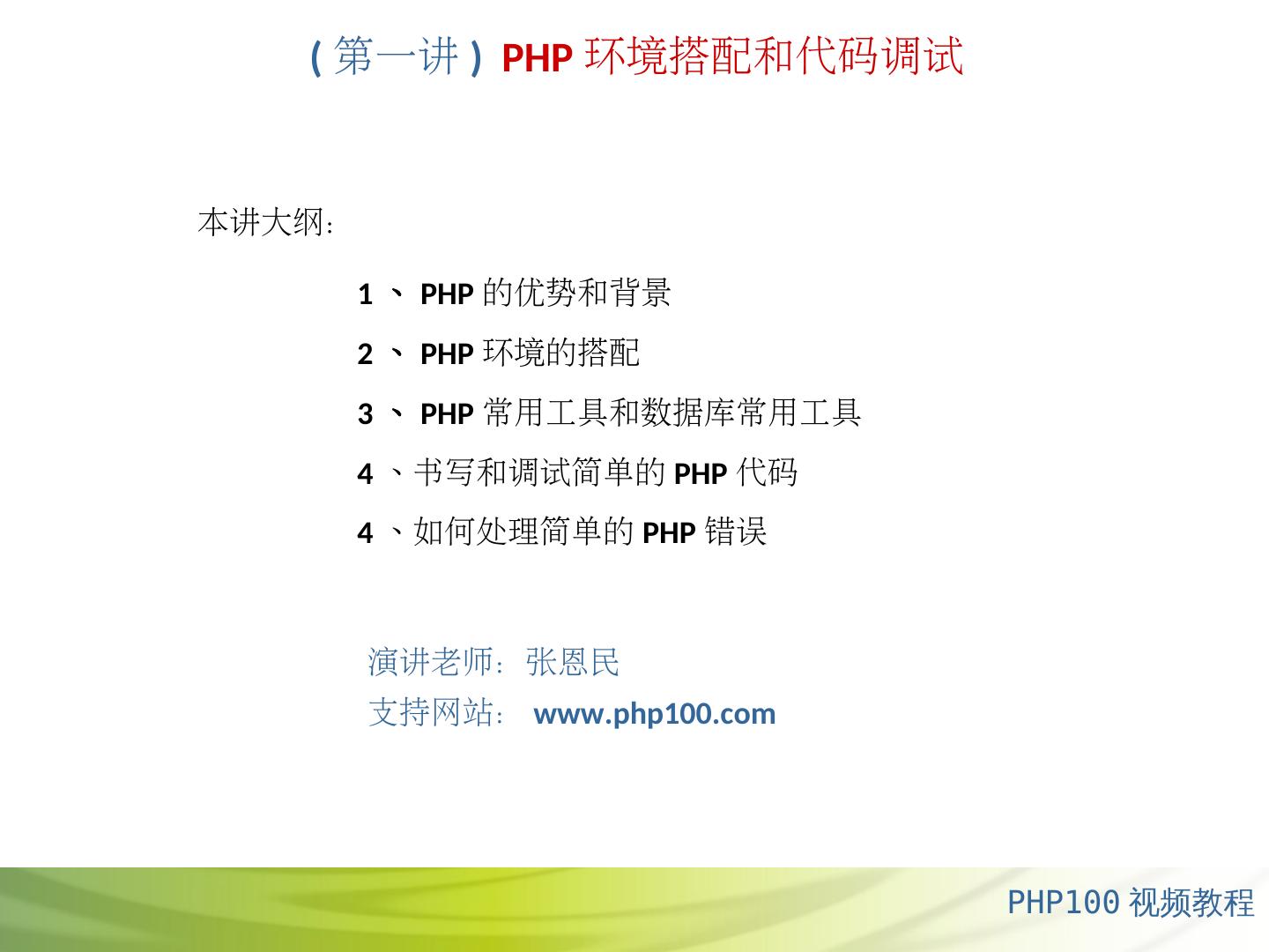2 . ( 第一讲 ) PHP 环境搭配和代码调试 本讲大纲: 1 、 PHP 的优势和背景 2 、 PHP 环境的搭配 3 、 PHP 常用工具和数据库常用工具 4 、书写和调试简单的 PHP 代码 4 、如何处理简单的 PHP 错误 演讲老师:张恩民 支持网站: www.php100.com PHP100 视频教程
