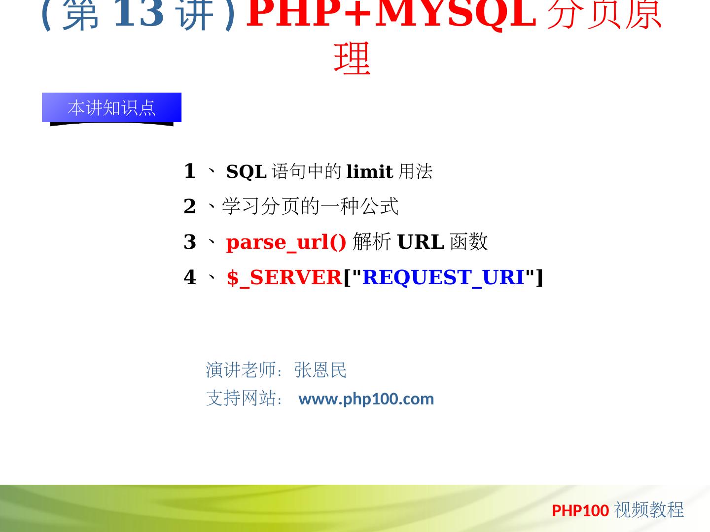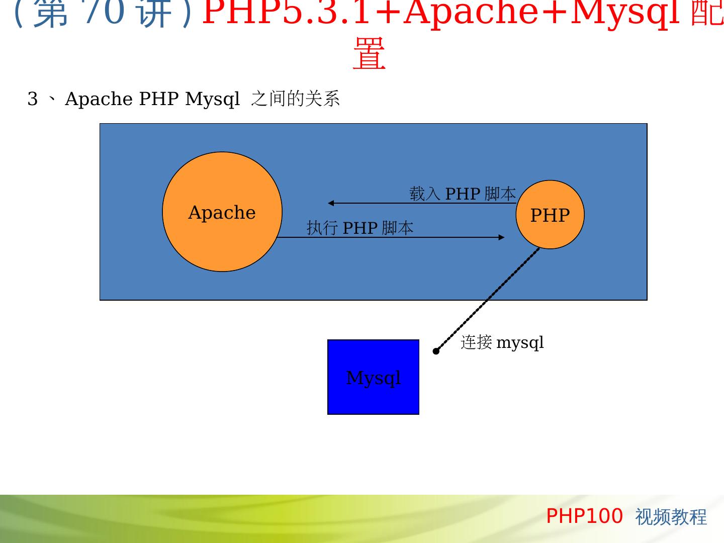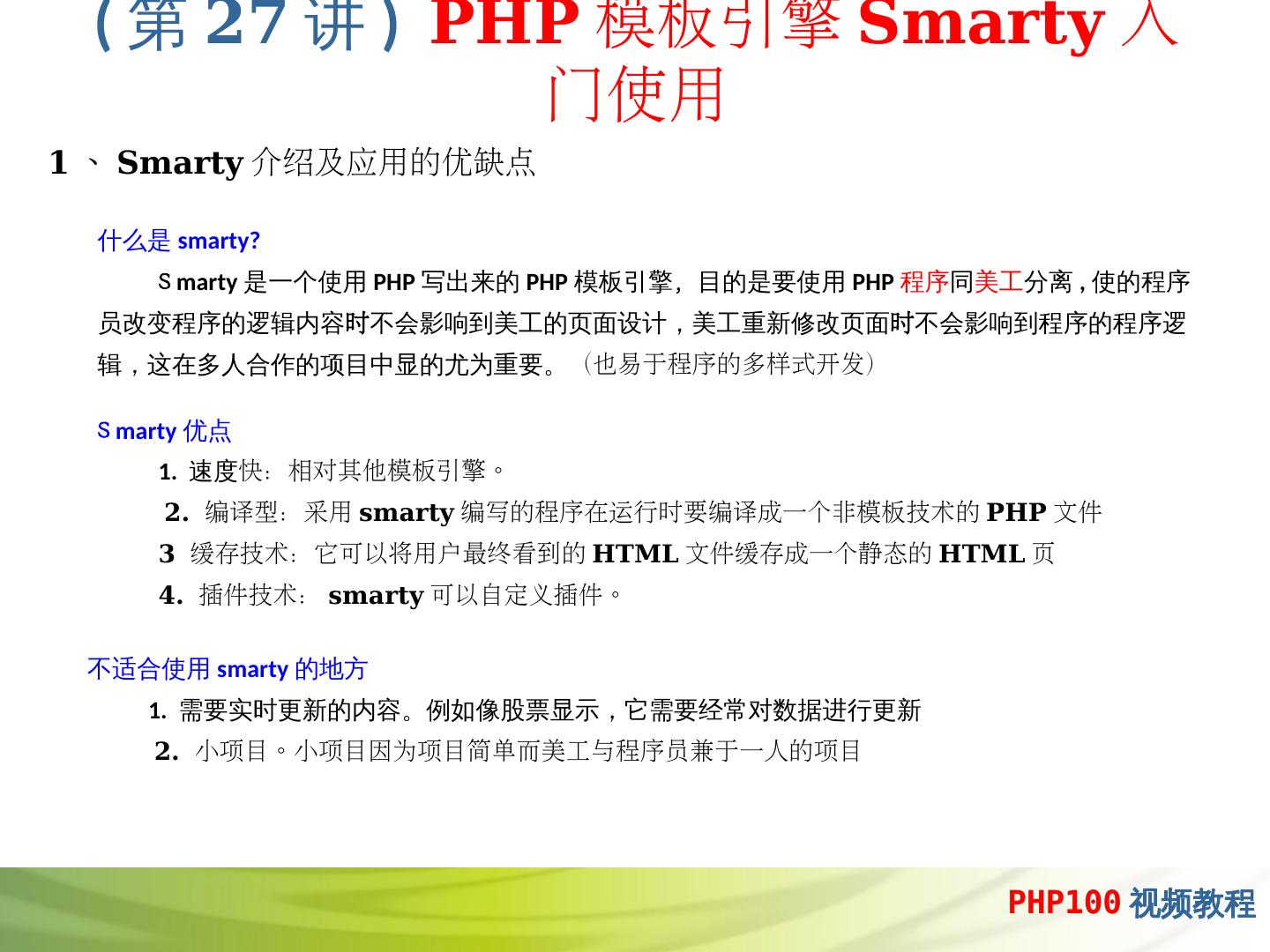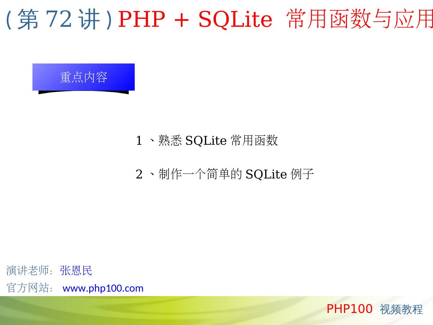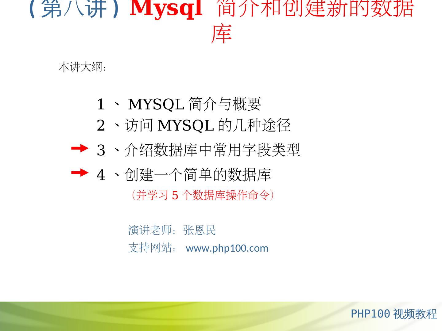 2 . ( 第一讲 ) PHP 环境搭配和代码调试 本讲大纲: 1 、 PHP 的优势和背景 2 、 PHP 环境的搭配 3 、 PHP 常用工具和数据库常用工具 4 、书写和调试简单的 PHP 代码 4 、如何处理简单的 PHP 错误 演讲老师:张恩民 支持网站: www.php100.com PHP100 视频教程