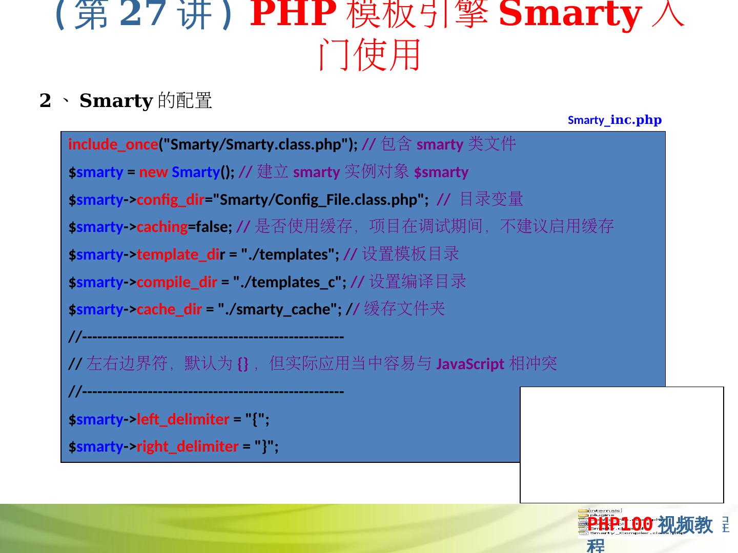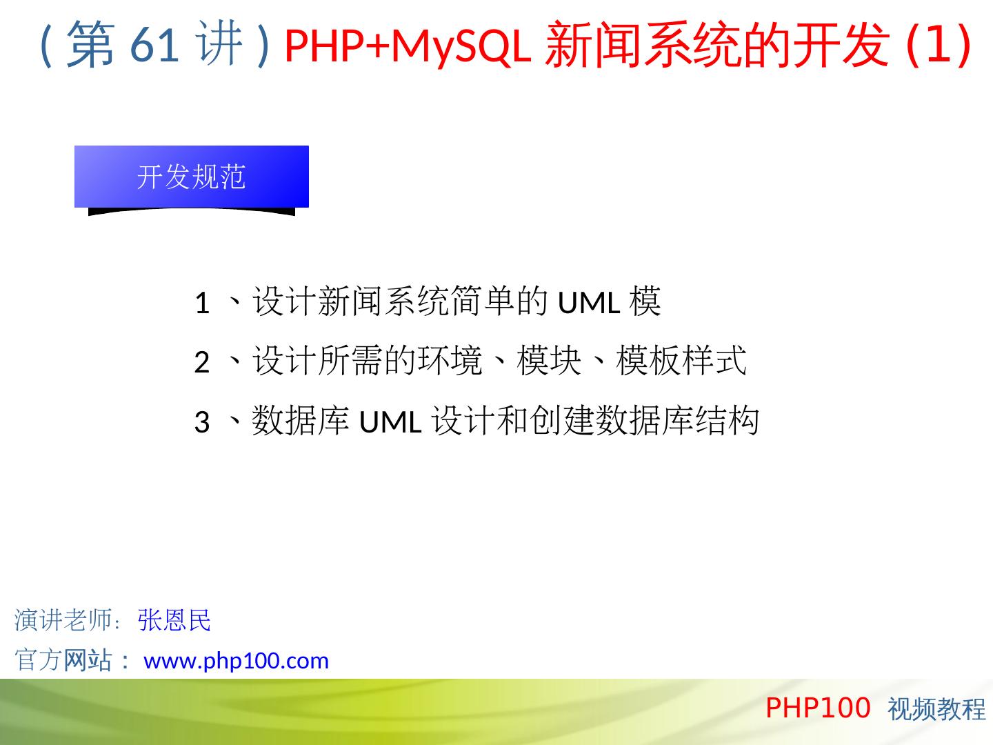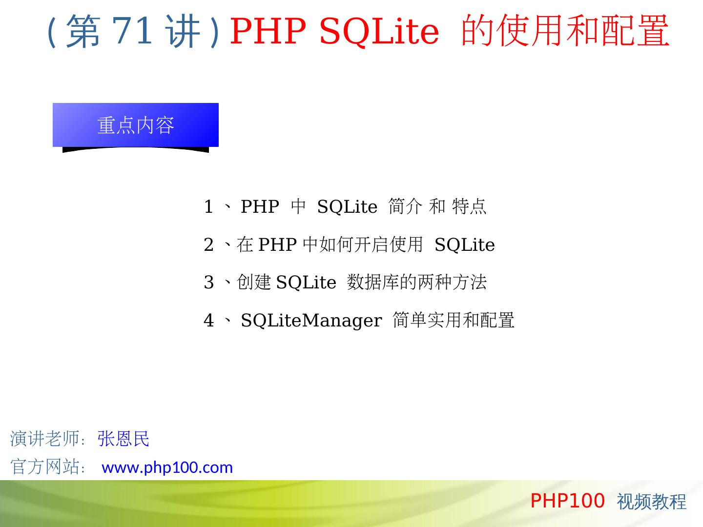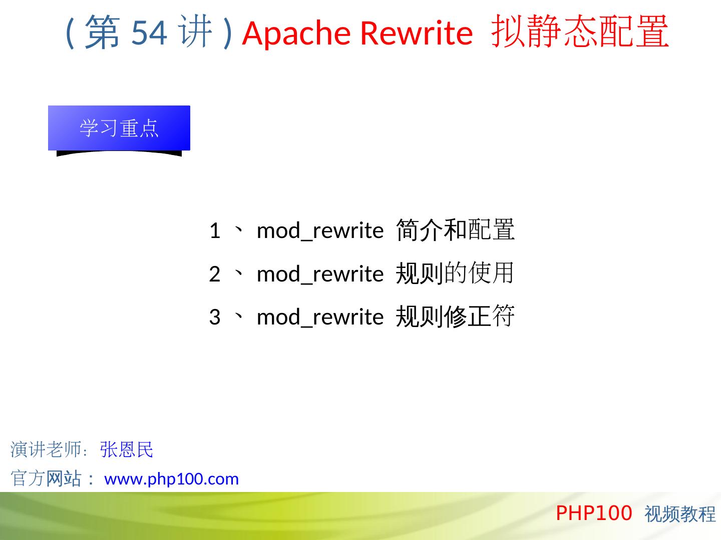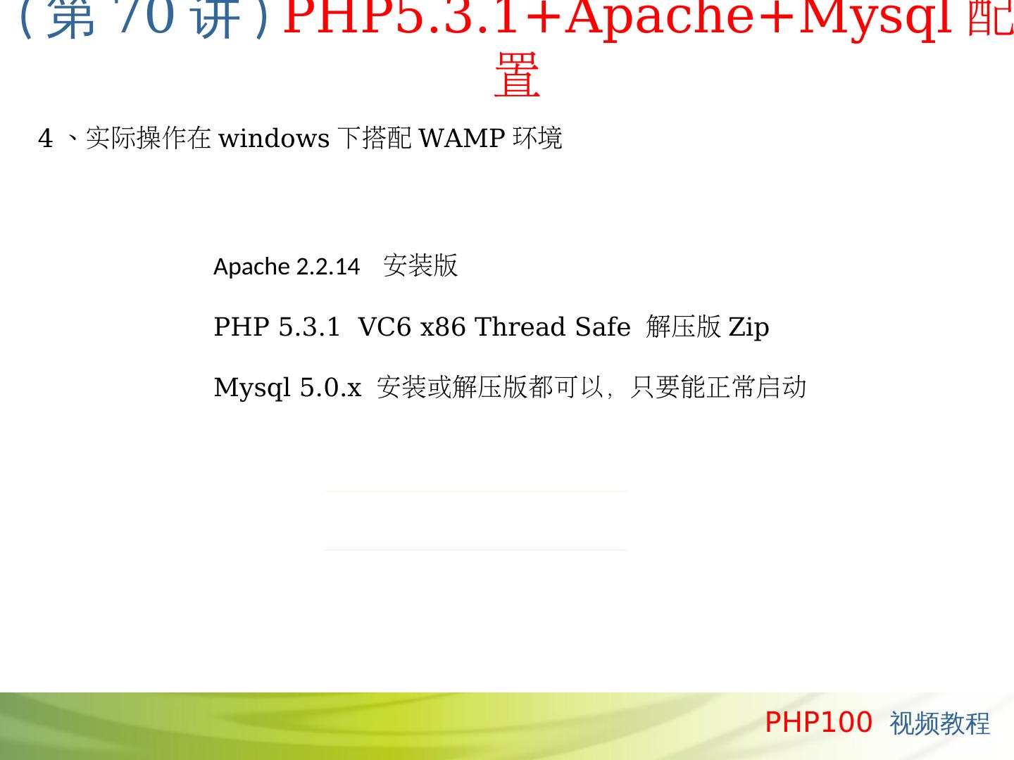 2 . ( 第一讲 ) PHP 环境搭配和代码调试 本讲大纲: 1 、 PHP 的优势和背景 2 、 PHP 环境的搭配 3 、 PHP 常用工具和数据库常用工具 4 、书写和调试简单的 PHP 代码 4 、如何处理简单的 PHP 错误 演讲老师:张恩民 支持网站: www.php100.com PHP100 视频教程